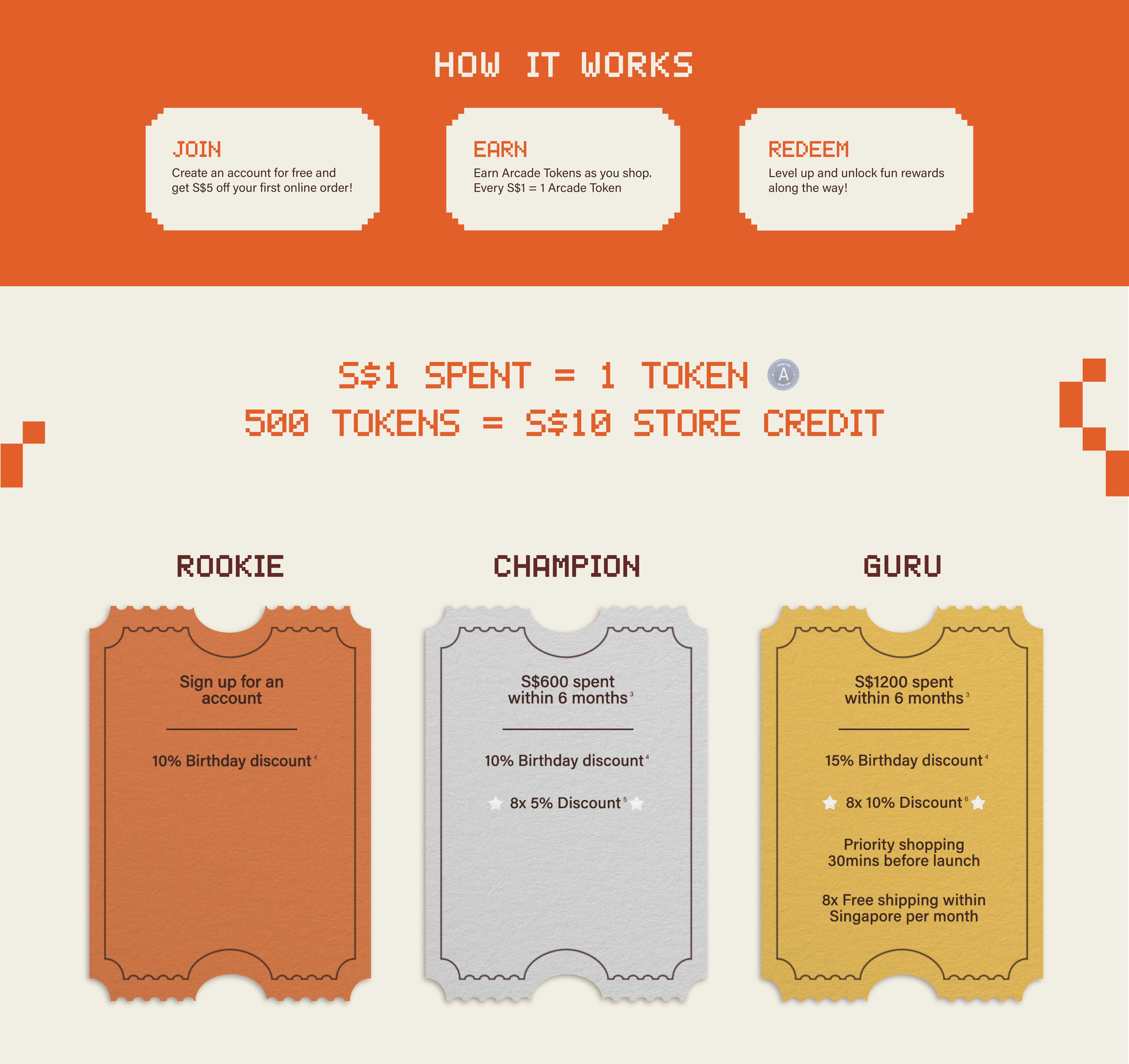 - Tokens can be redeemed every 500 Tokens for S$10 off your purchase.