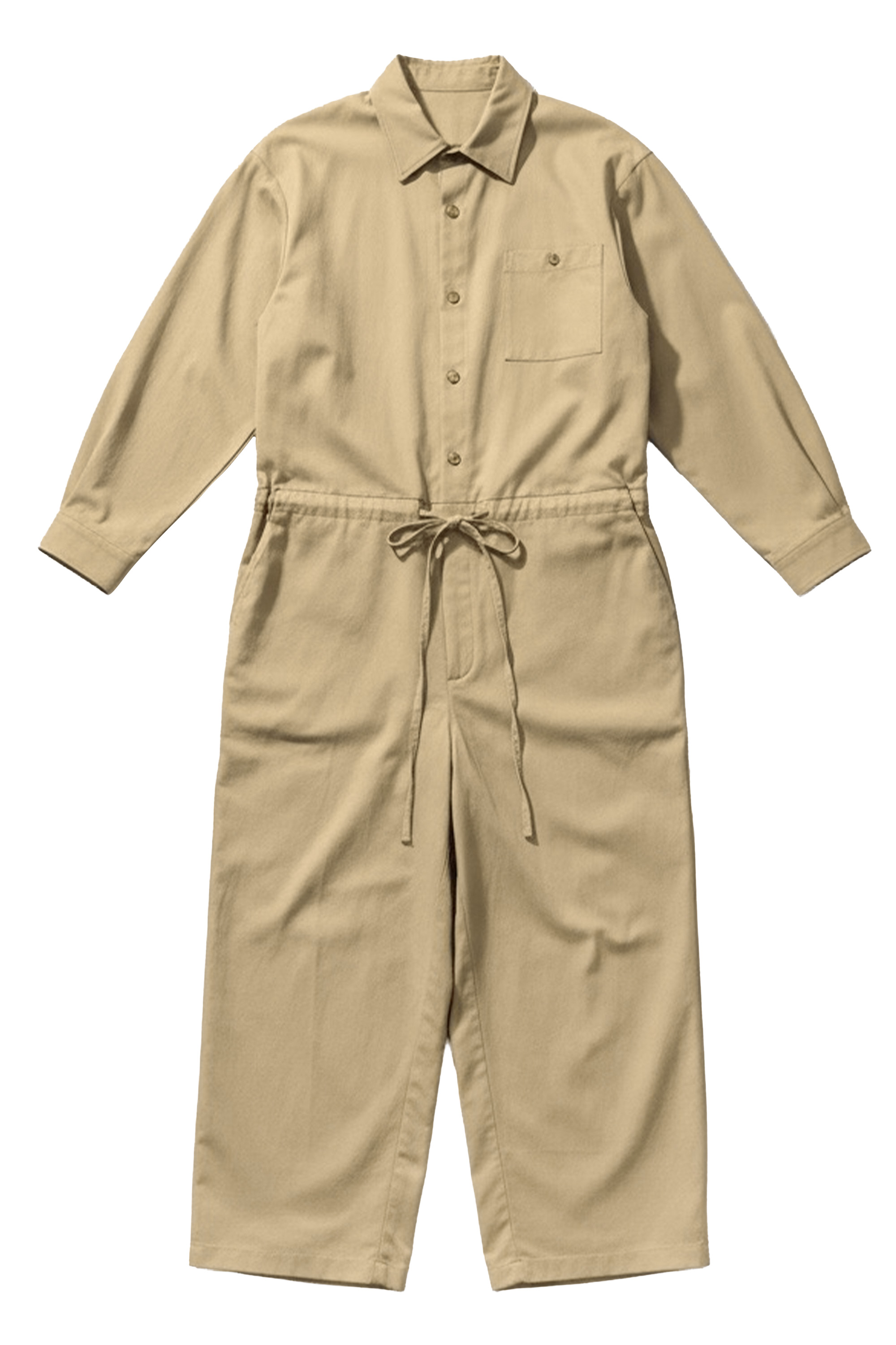 The Ansel Utility Boilersuit is fitted with a pointed collar, a left chest patch pocket with a single button closure, side slanted pockets, a single back jetted pocket with a button closure, outer drawstring waistband, dual-button sleeve cuffs, dual-button leg opening adjustor tabs, a button up front and a zipper fly.