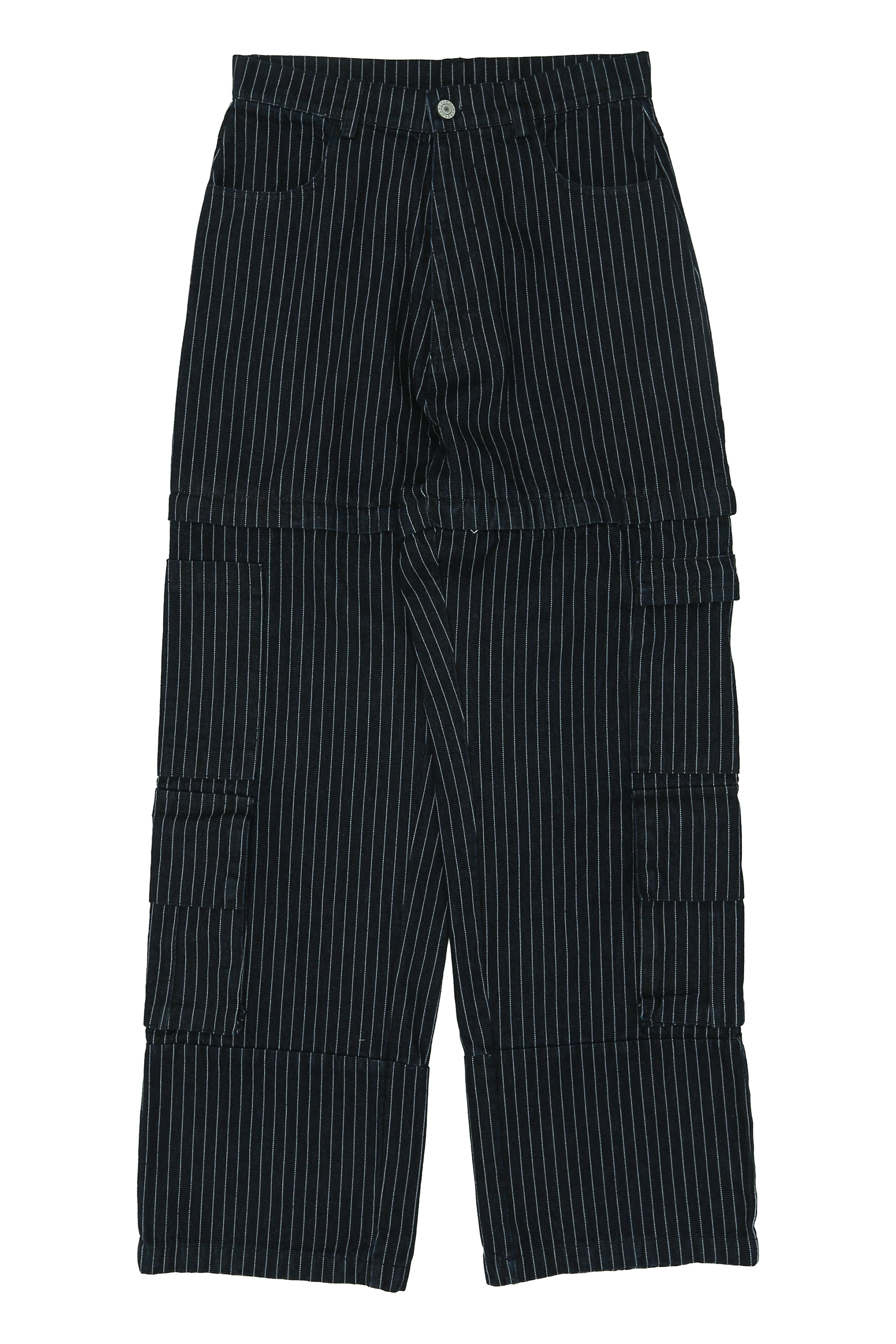 The Edric Hickory Striped Convertible Cargo Trousers are fitted with beltloops, side pockets, back pockets, 4 cargo pockets, zippered thigh connections, a hidden hanger loop at the leg openings and a zipper fly with button closure.