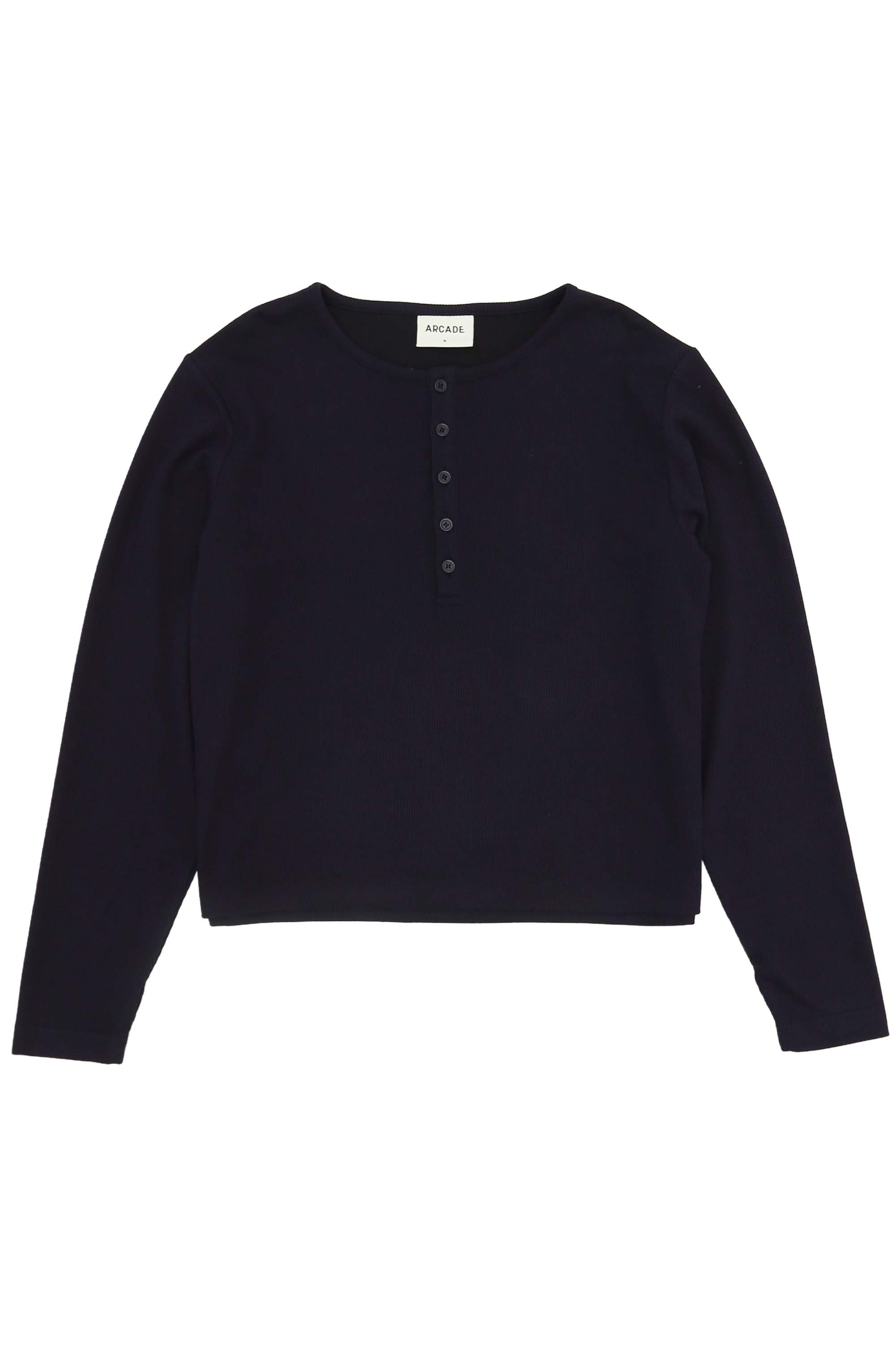 The West Cropped Henley Top is fitted with a 5-button henley placket and rounded collar.
