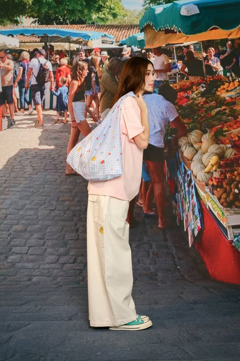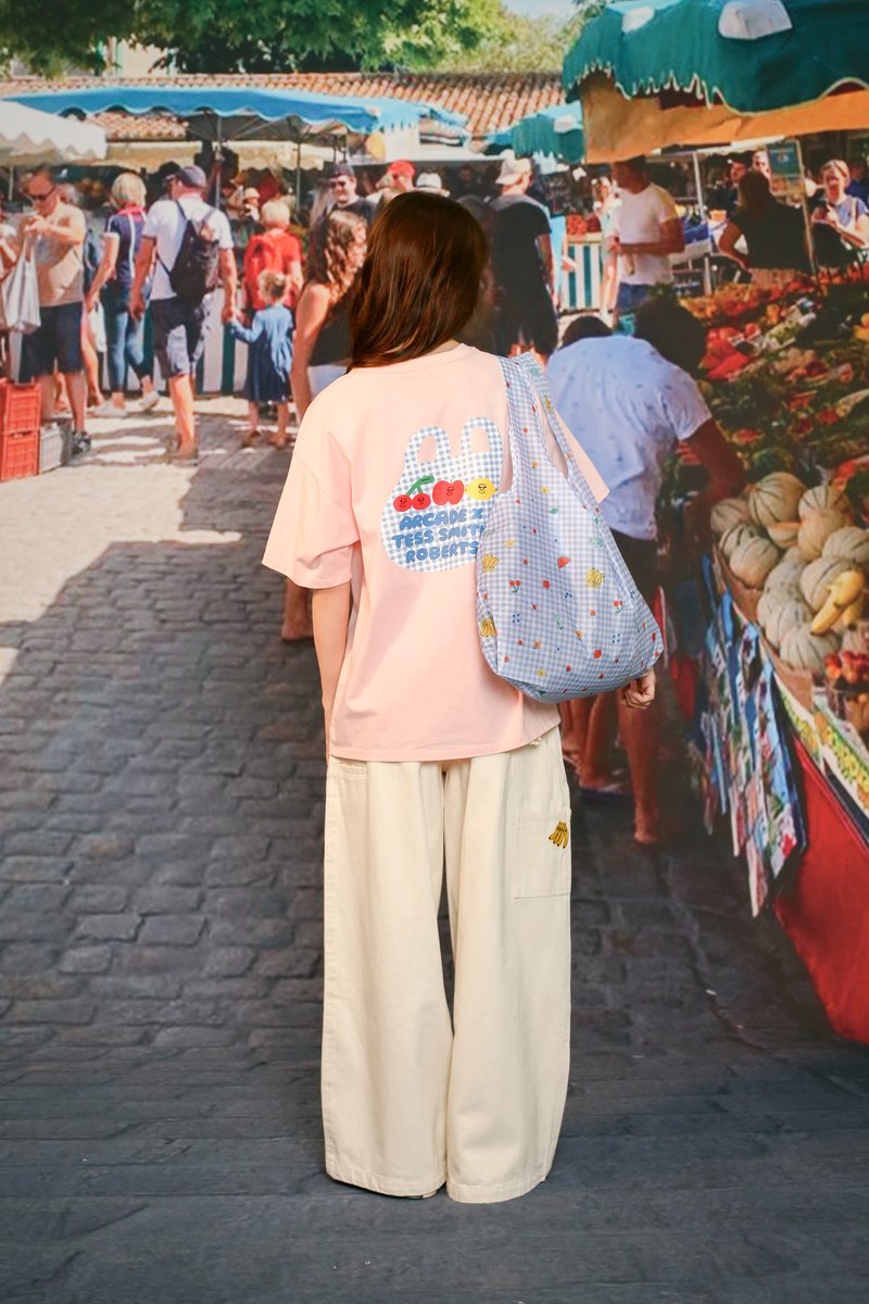 The Arcade x Tess Smith-Roberts “SUNDAY MARKET” Foldable Grocery Bag is an everyday essential made for effortless shopping. Featuring her signature fruit illustrations set against Arcade’s in-house gingham base print, it brings a bright and playful charm to your daily errands. Lightweight and designed to be foldable into a compact size, it’s easy to carry around wherever you go. Perfect for spontaneous grocery runs or keeping in your bag just in case. Practical, reusable, and undeniably cute.