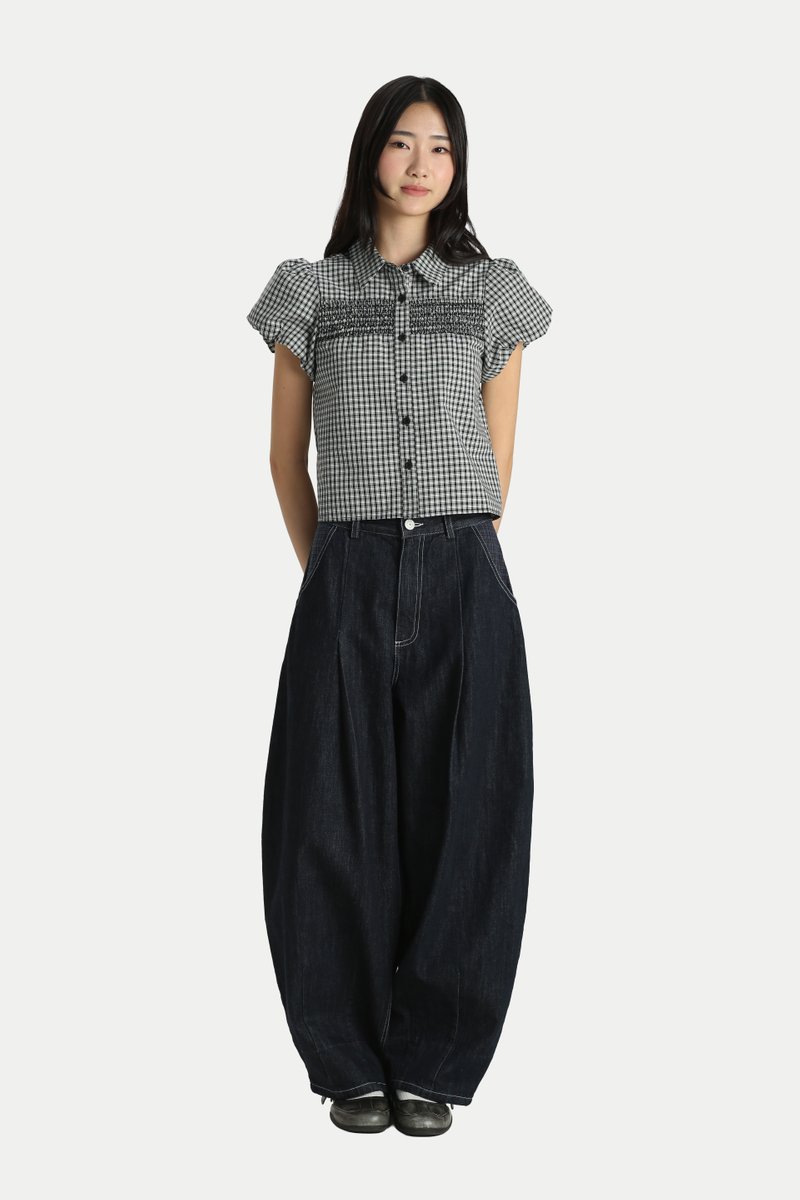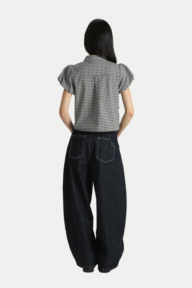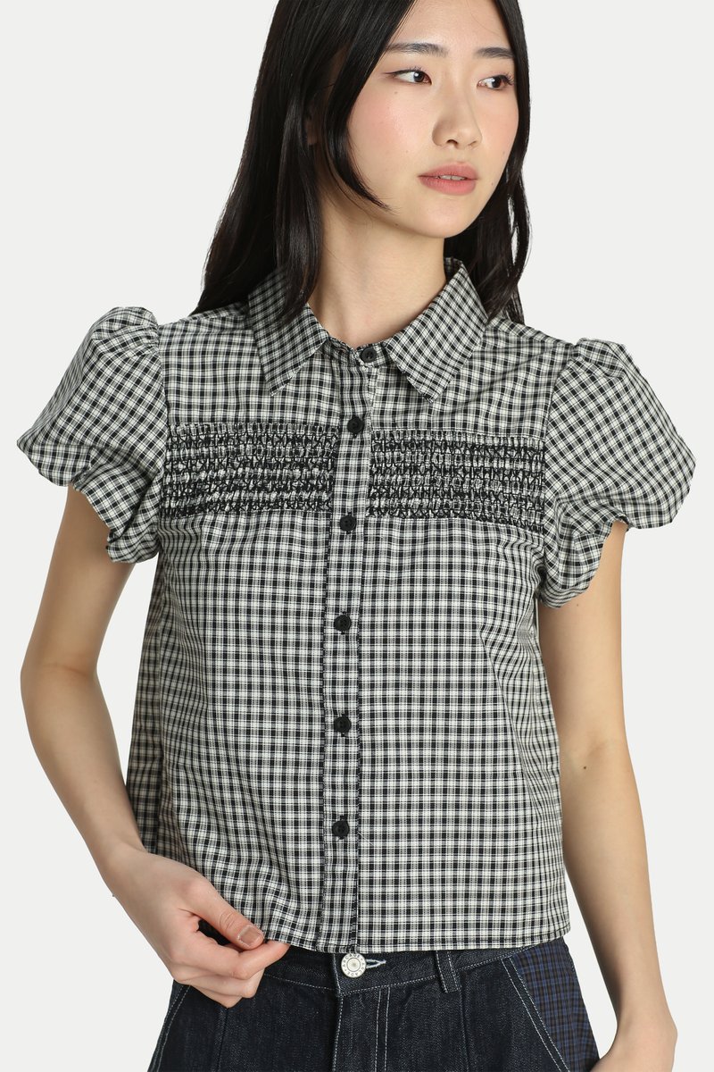 TESSA SHIRRED PUFF SLEEVE TOP IN BLACK CHECKS
