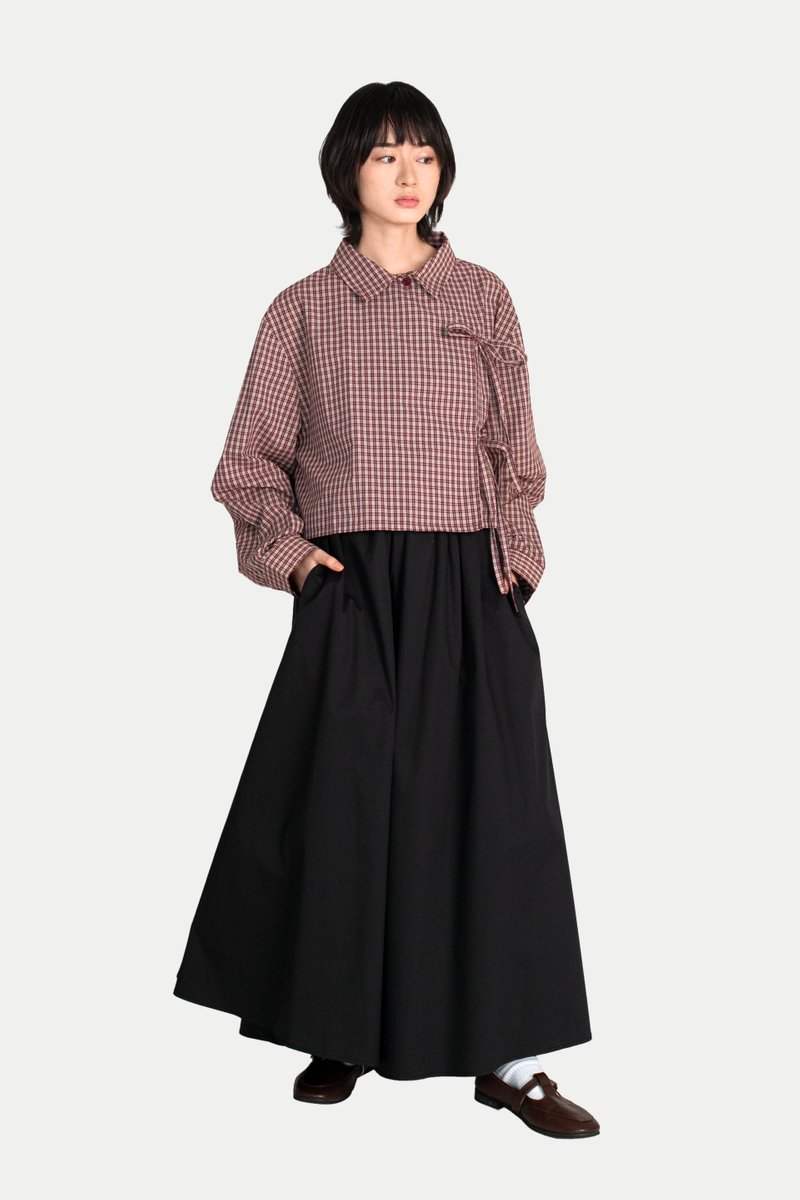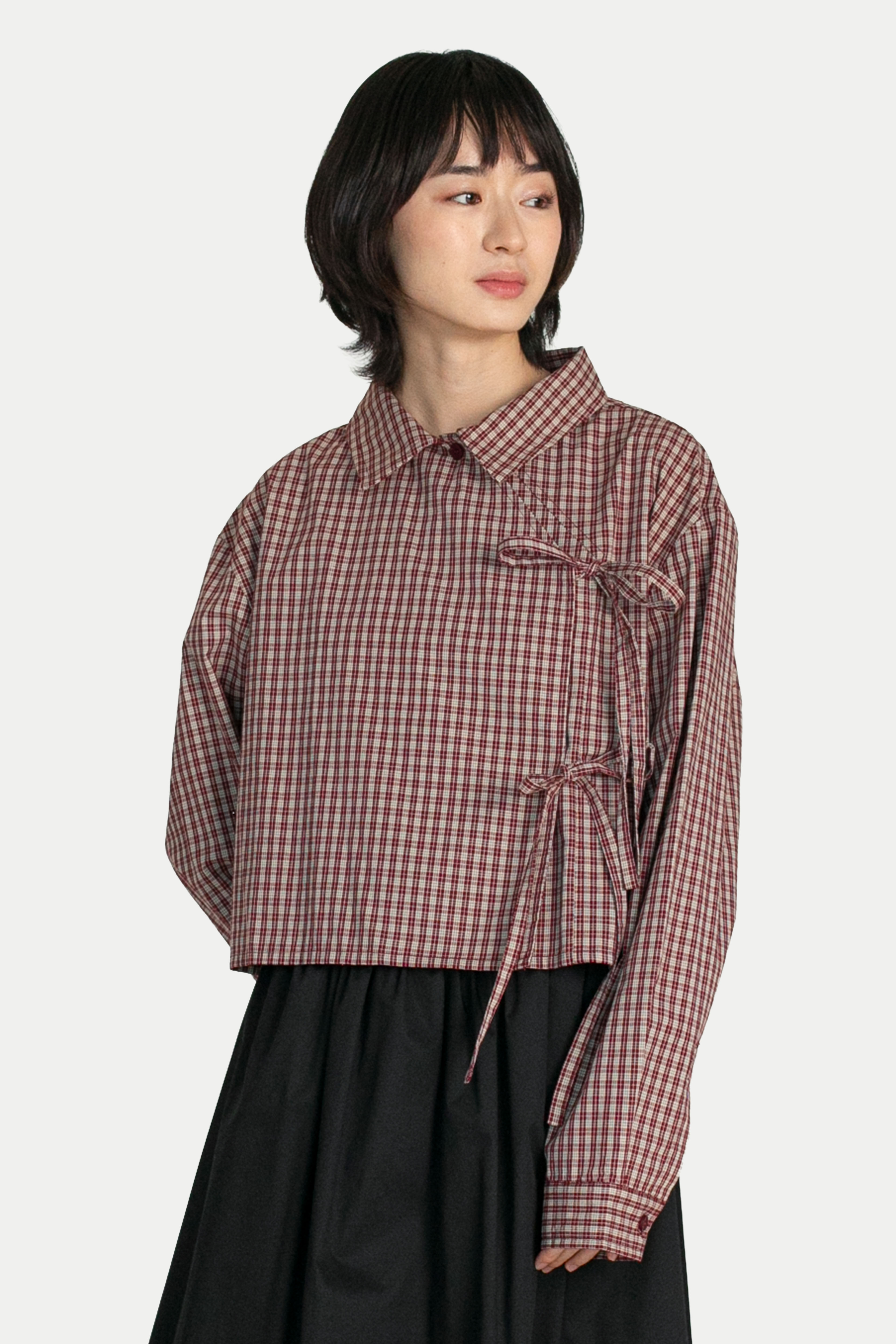 YUKI DOUBLE-BREASTED RIBBON CROP SHIRT IN BERRY CHECKS