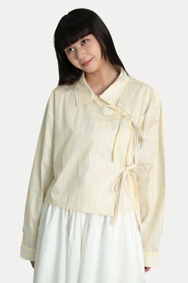 YUKI DOUBLE-BREASTED RIBBON CROP SHIRT IN BUTTER STRIPES