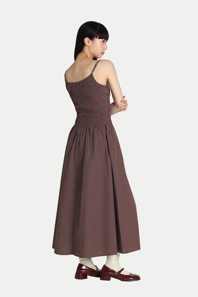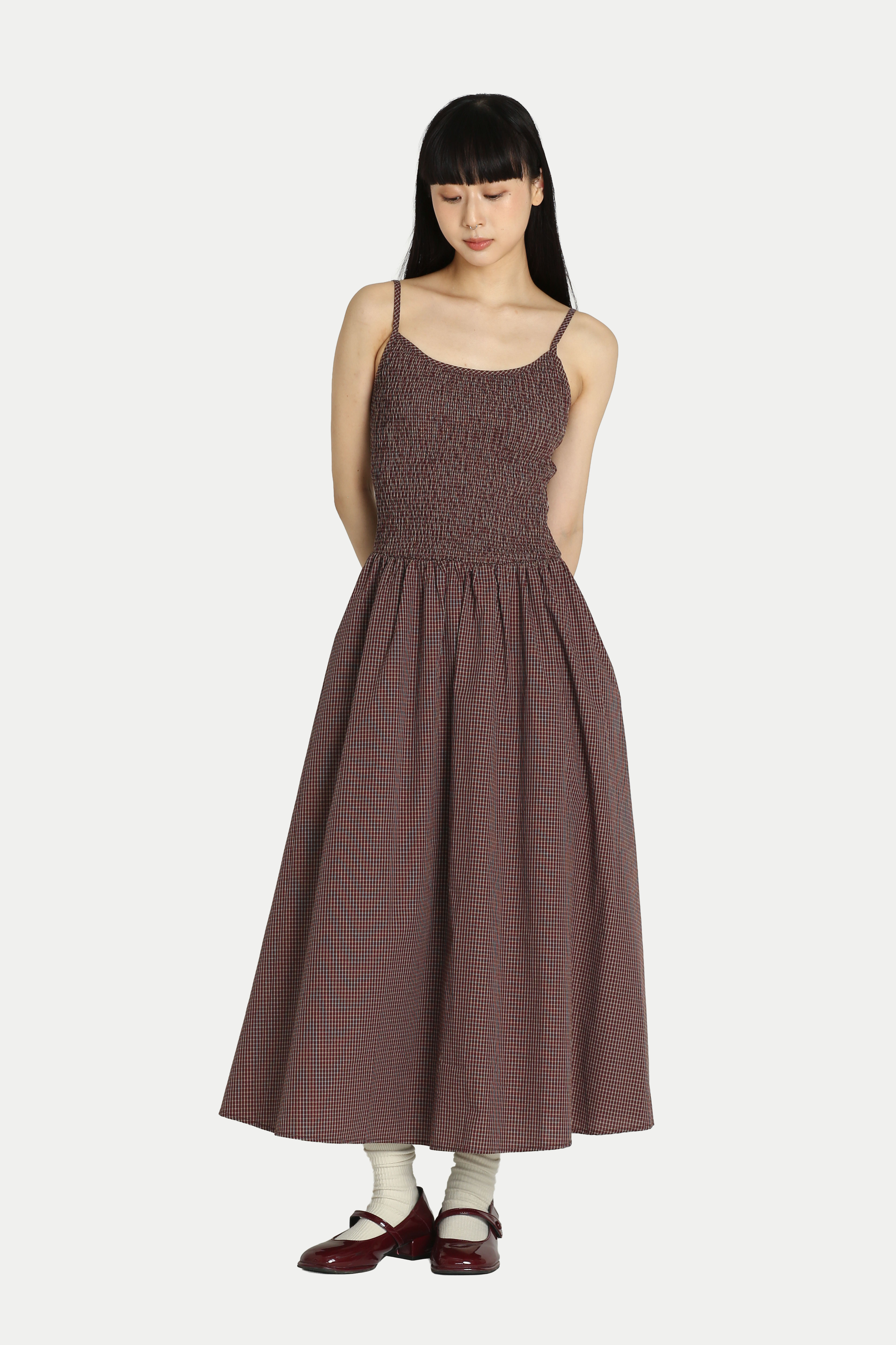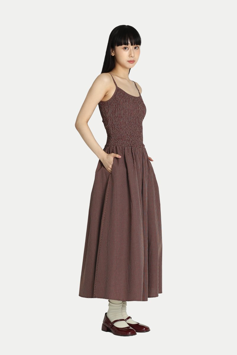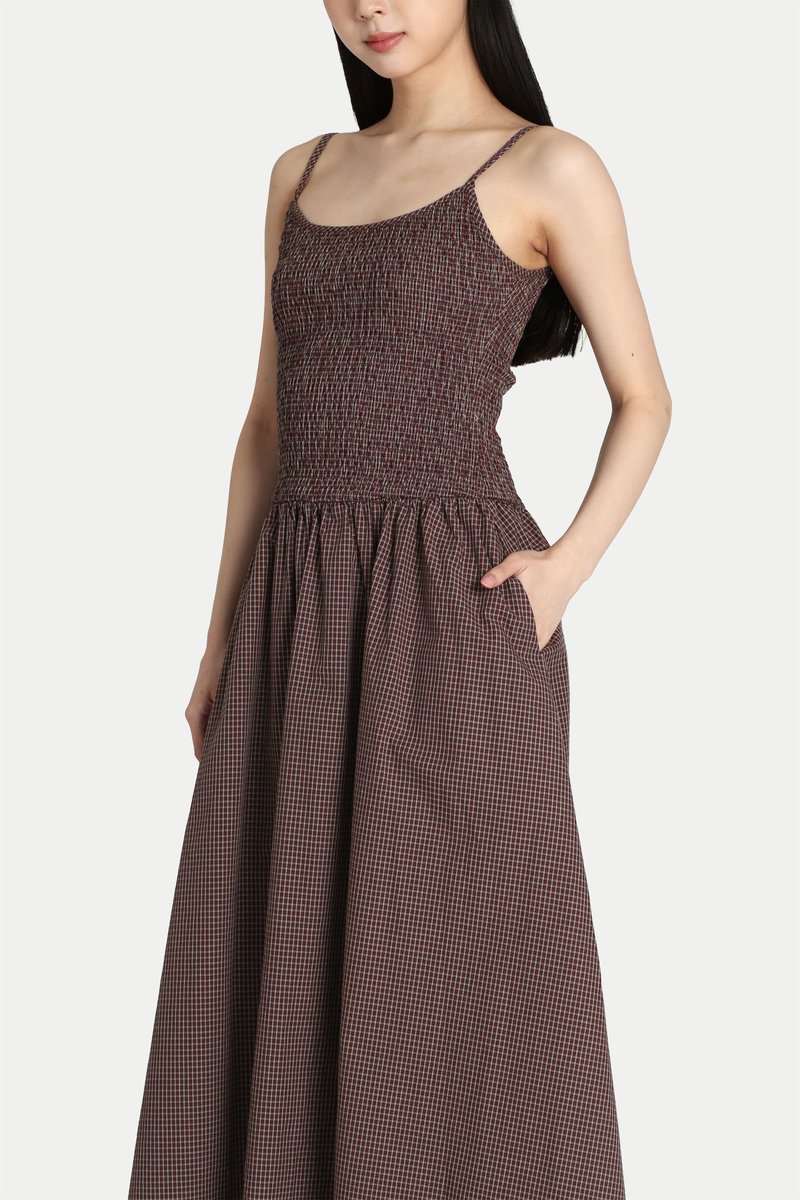 The Daelyn Checkered Shirred Midi Dress is the perfect choice for special occasions. It features a shirred bodice paired with a flared midi skirt, creating a slimming silhouette with a fairytale feel. Style it with a cute cardigan or wear it on its own. Designed with side pockets for added functionality. Slip on wear. Unlined.