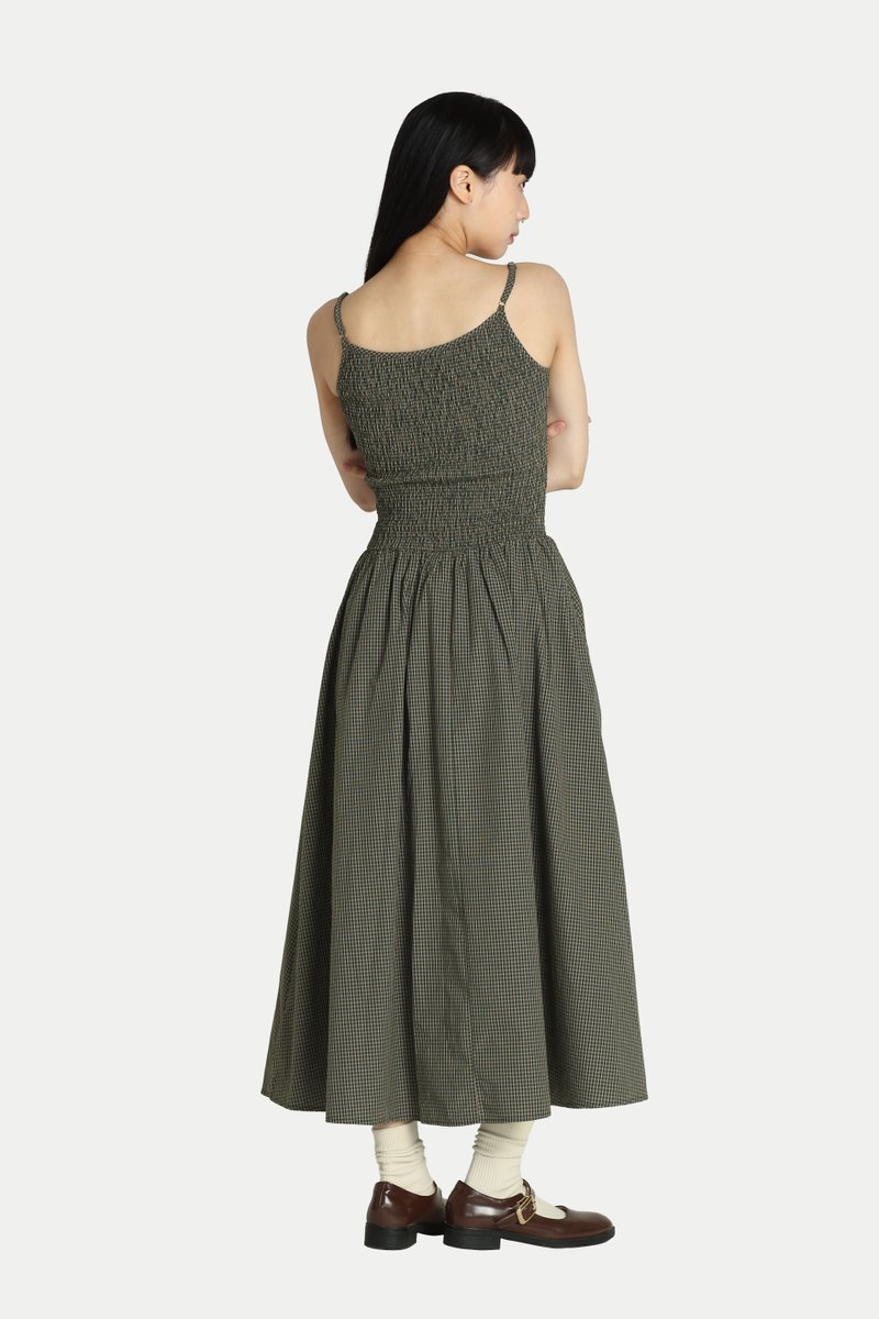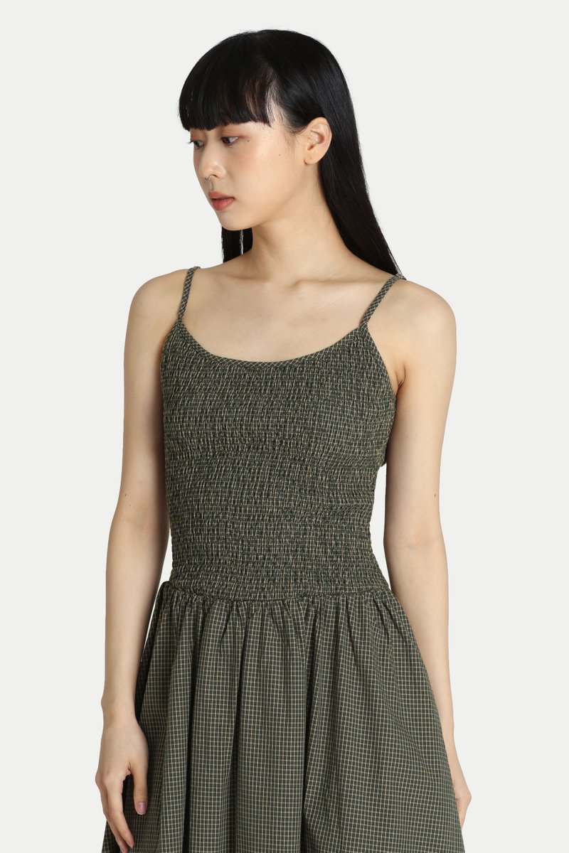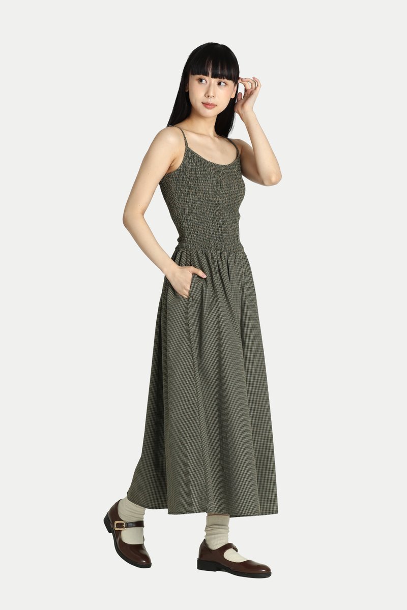 DAELYN CHECKERED SHIRRED MIDI DRESS IN MOSS