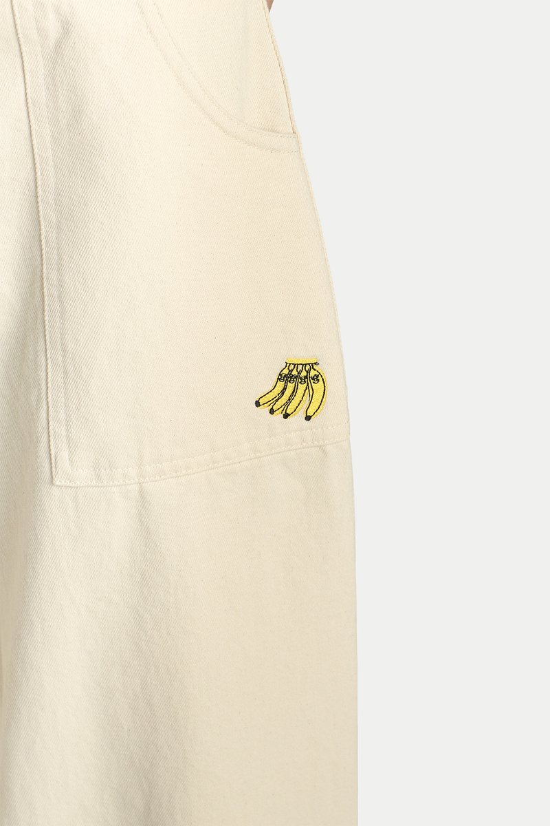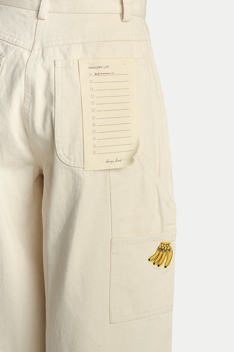 The Arcade x Tess Smith-Roberts “BAD BANANAS” Work Jeans are subtly cute and effortlessly wearable for everyday life. Featuring Tess Smith-Roberts’ quirky banana illustrations embroidered across the jeans, this piece combines a simple, elevated workwear silhouette with an artistic twist. Functional details include multiple pockets and a surprise grocery list label on the back pocket, making the jeans as practical as they are unique. Cut from comfortable denim fabric, they allow for easy movement and come with functional side and back pockets. The jeans open via a front fly with buttons and are unlined.