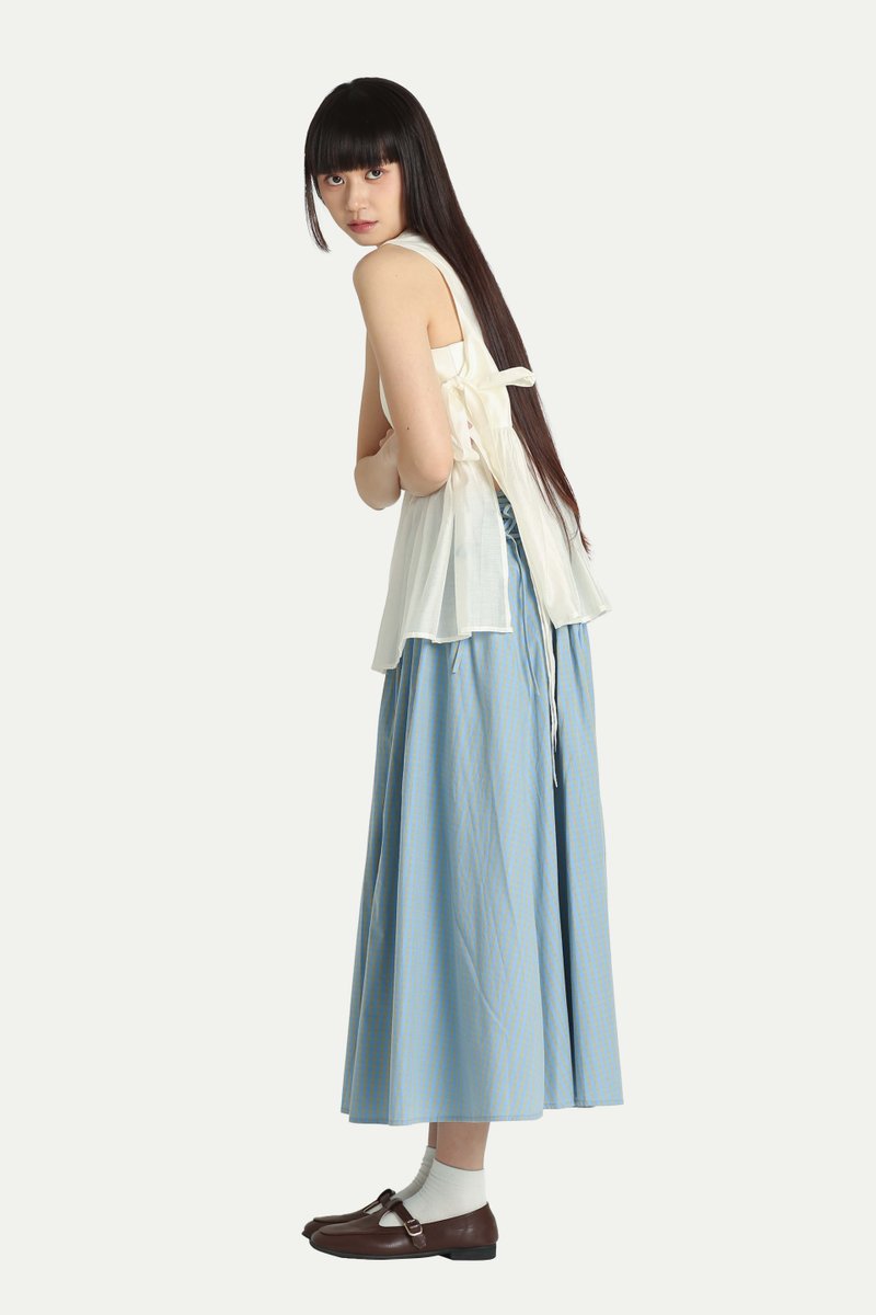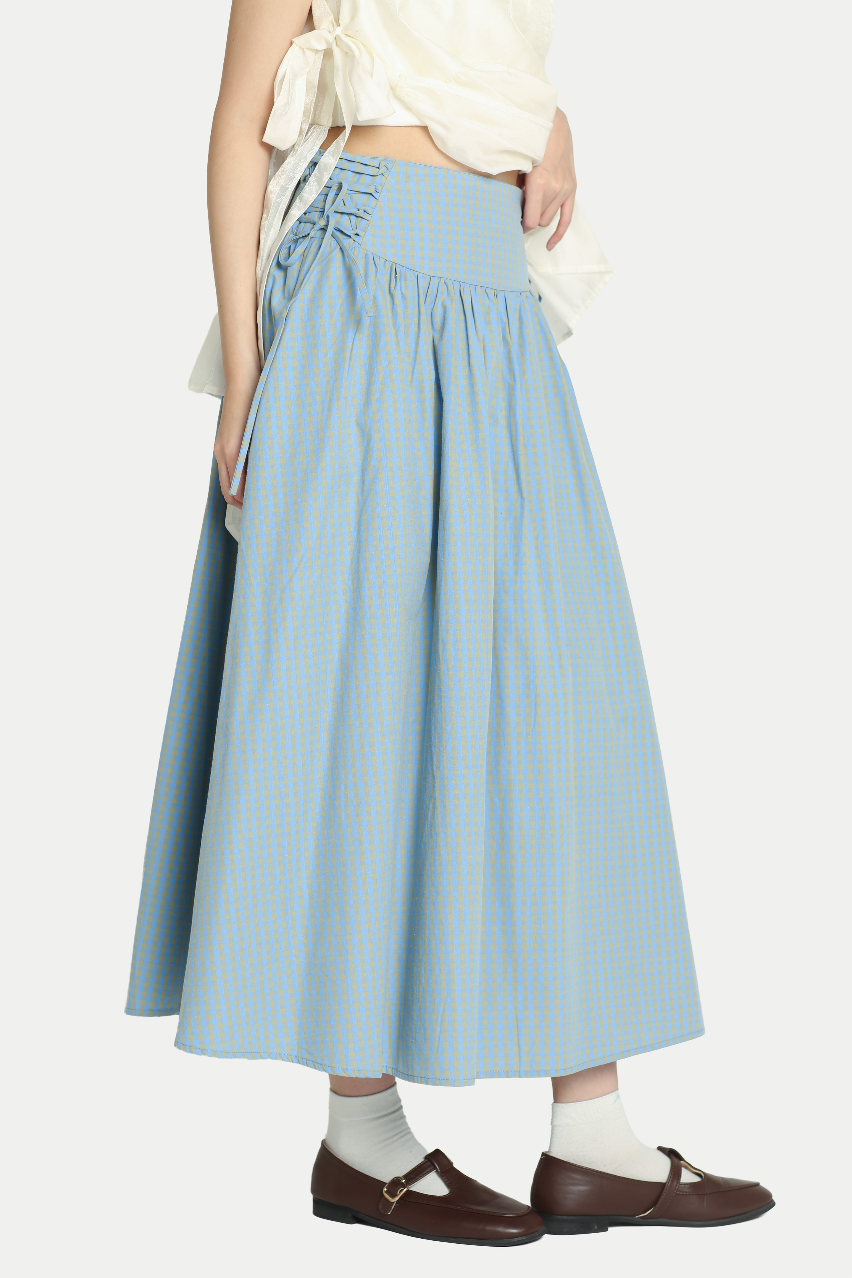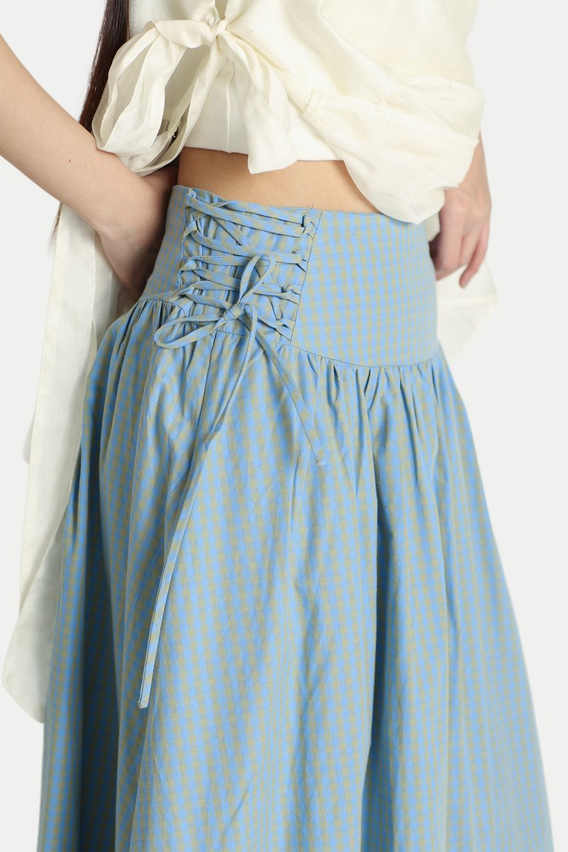 TSUKI SIDE CORSET MIDI SKIRT IN SKY CHECKS