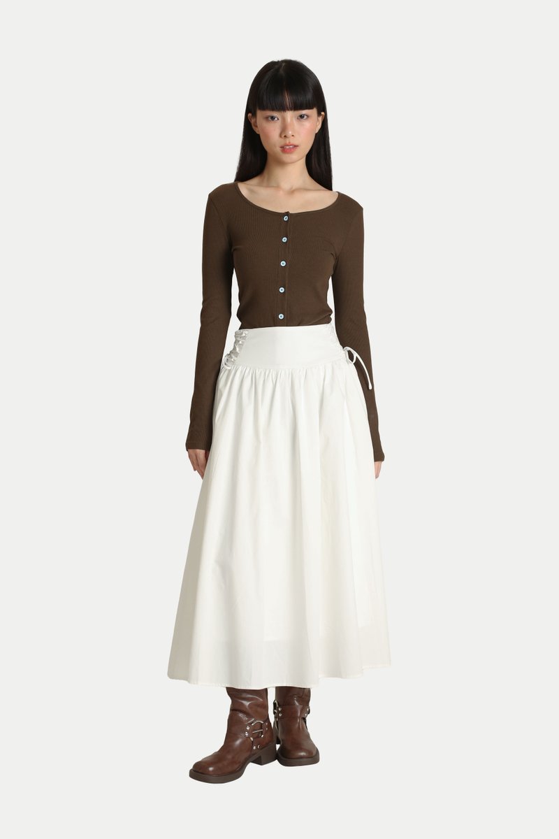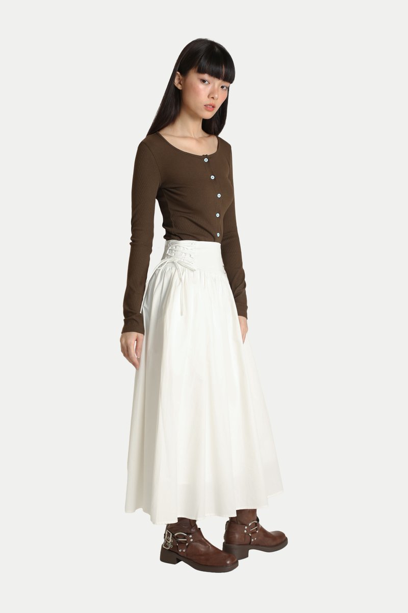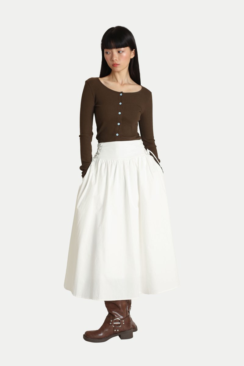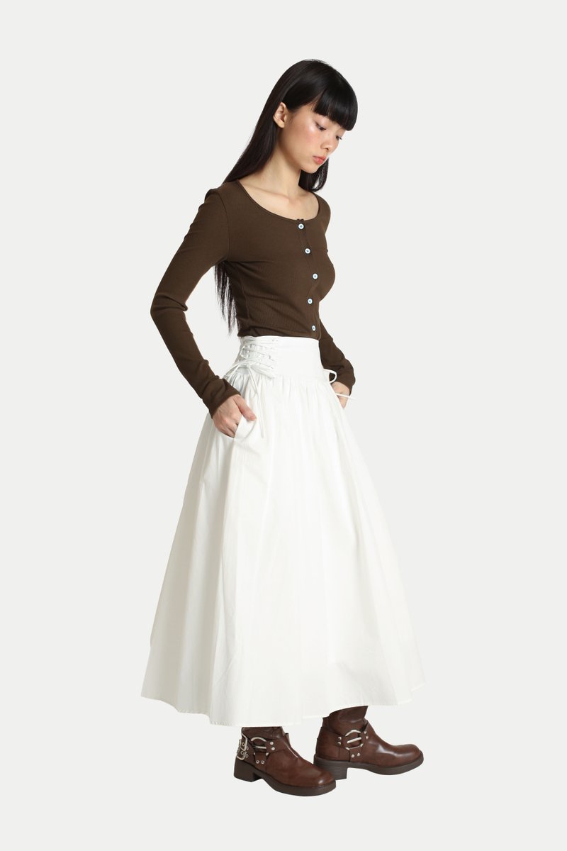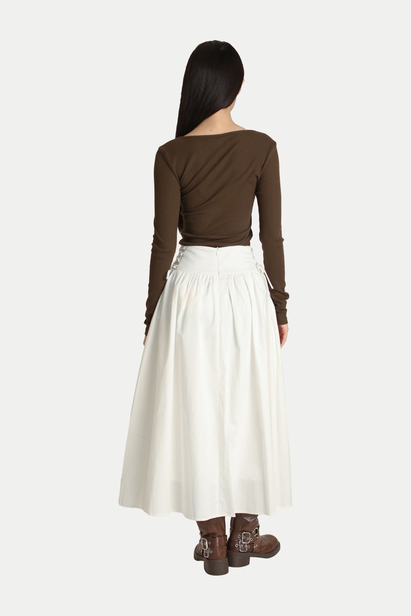 The Tsuki Side Corset Midi Skirt is the perfect detailed staple to elevate your wardrobe. It features a structured yoke with side corset detailing for a cinched waist and added visual interest. Beautiful gathers throughout create a voluminous, flattering flare. Crafted from a breathable cotton-blend material, it's incredibly comfortable—even in blazing heat. Designed with practical side pockets for added convenience. Opens via a back concealed zip. Fully lined