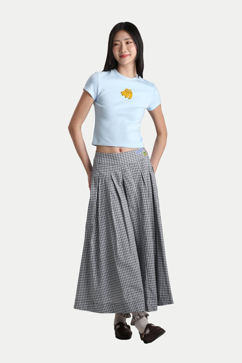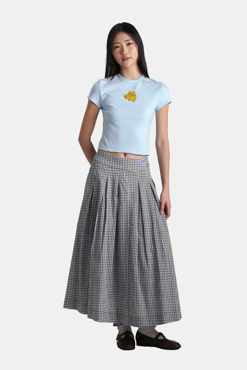 The Arcade x Tess Smith-Roberts “BAD BANANAS” Contrast-Stitch Baby Tee is a classic, easy-to-love staple. Featuring Tess Smith-Roberts’ signature fruit illustration printed on the front, it adds a playful touch to a timeless baby tee silhouette. Cut from soft cotton jersey, the fabric has a comfortable stretch that moves with you, making it perfect for everyday wear. Finished with contrast stitching for a subtle pop of detail. Style it with jeans for an effortlessly cute look, or pair it with a pleated skirt for a charming girl-next-door feel. Slip-on wear. Unlined.