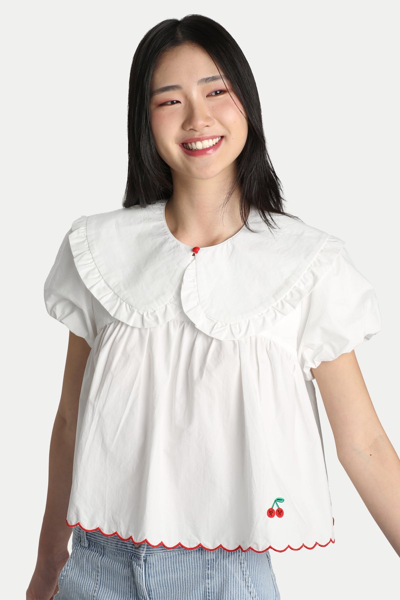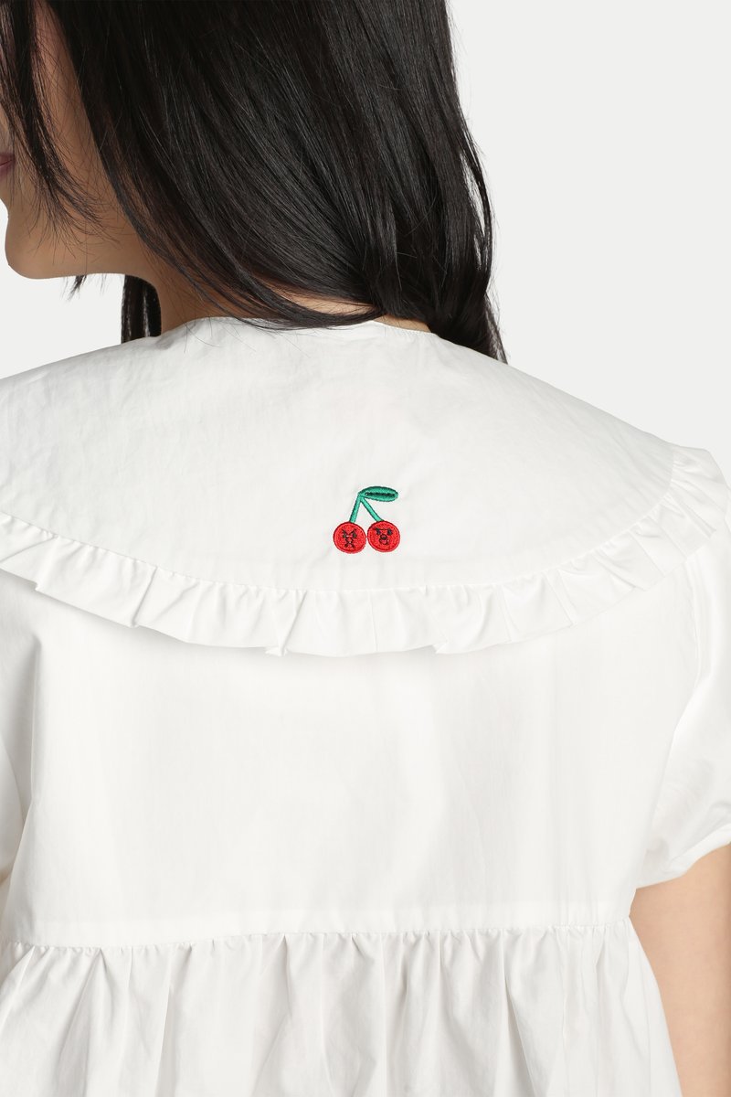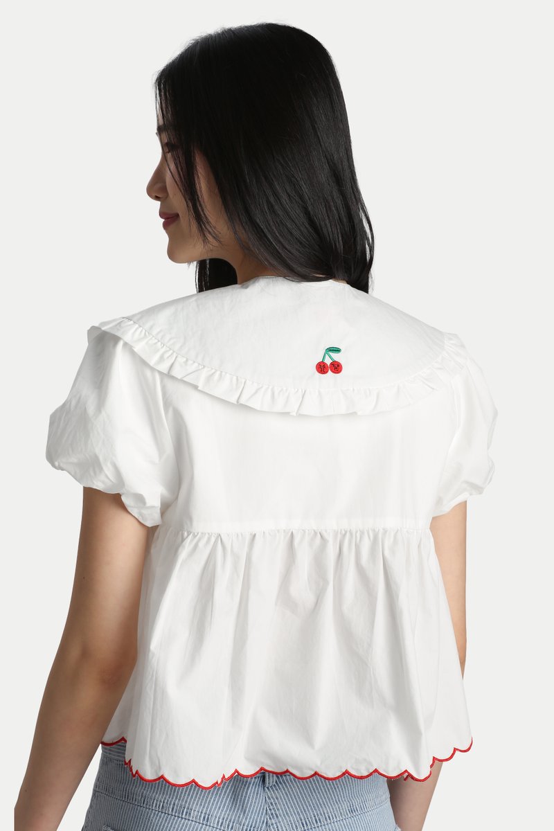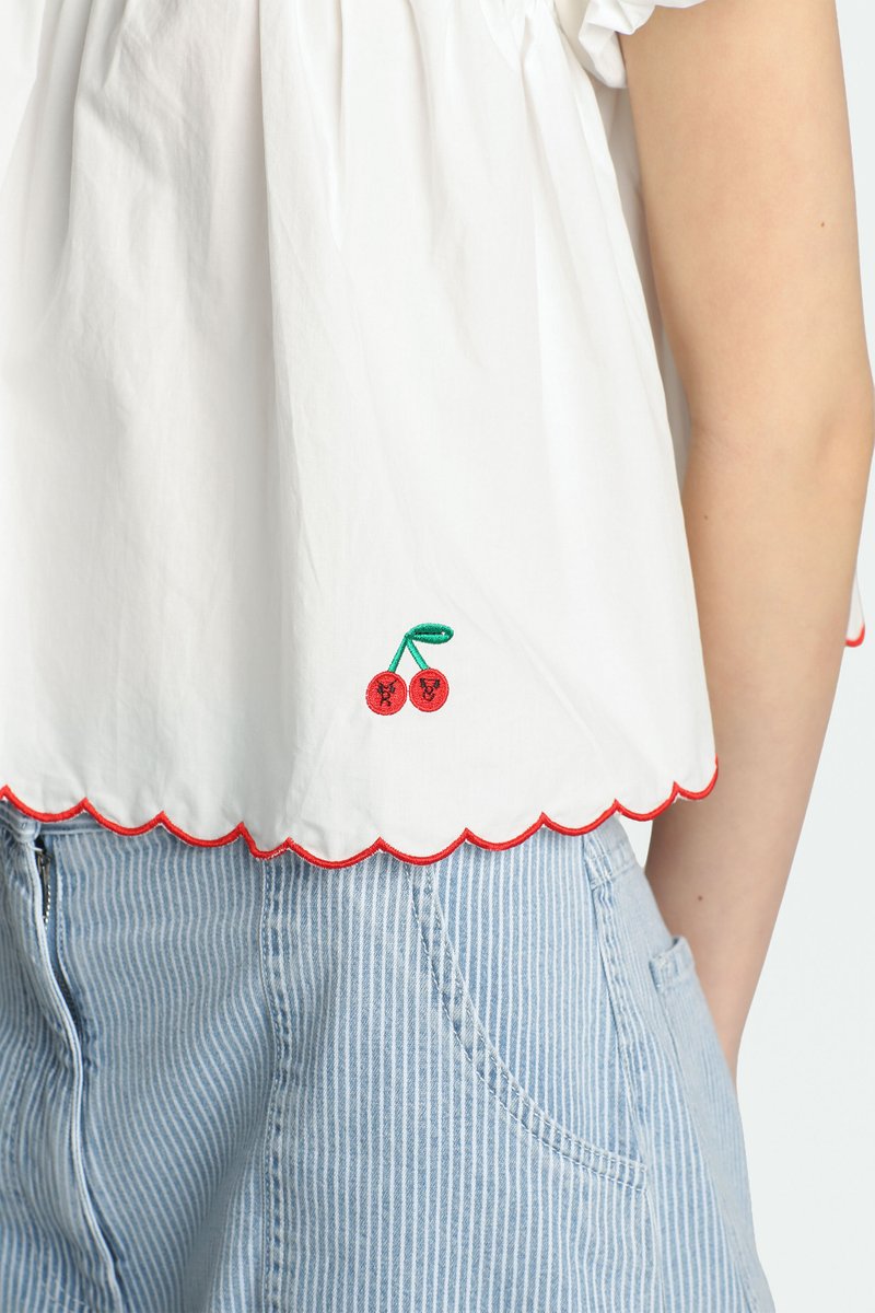 The Arcade x Tess Smith-Roberts “CHERRY” Detachable Bib Scallop Babydoll Top is trendy and quirky. Featuring Tess Smith-Roberts’ all-over fruit illustrations paired with Arcade’s in-house gingham print, it creates a charming, playful pattern. The top comes with a detachable frill bib that can be styled on or off, and its babydoll flare silhouette brings the fun illustrations to life. Easily pair it with jeans for a casual look or a mini skirt for something cute. Made from a breathable cotton-blend fabric, it’s perfect for warm weather. Opens via a back keyhole, slip-on wear. Unlined.