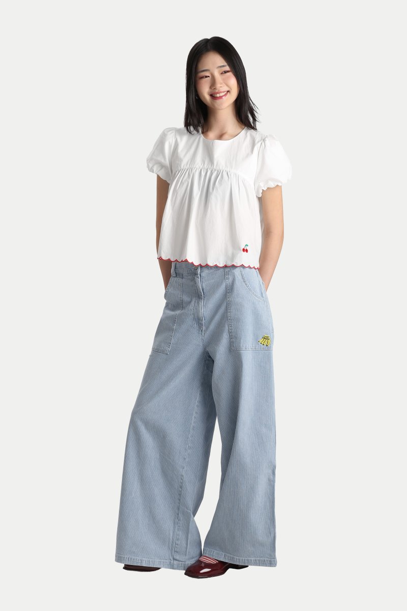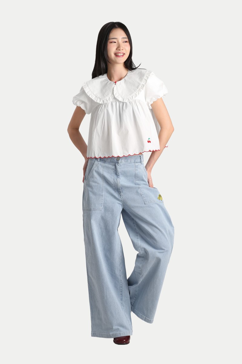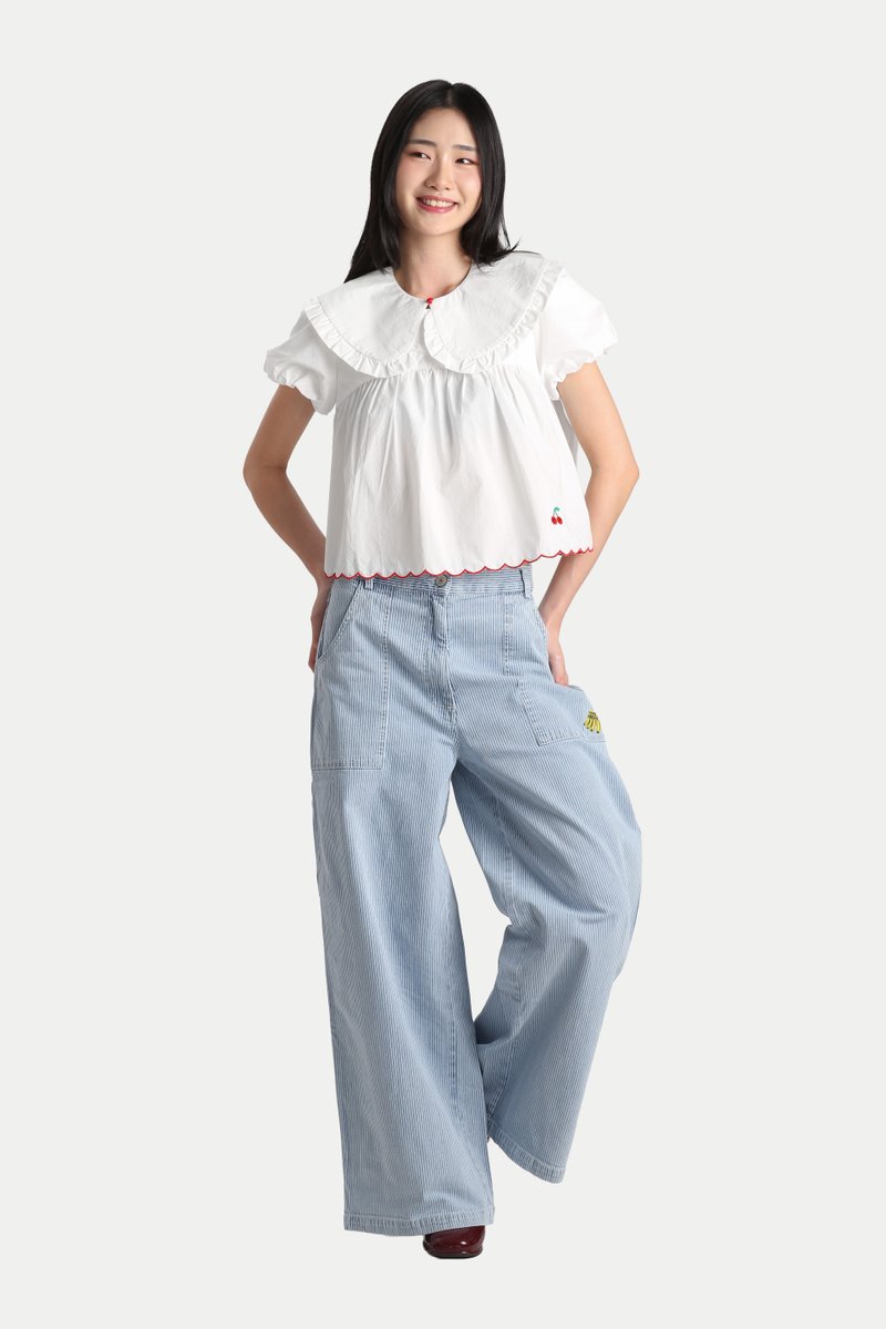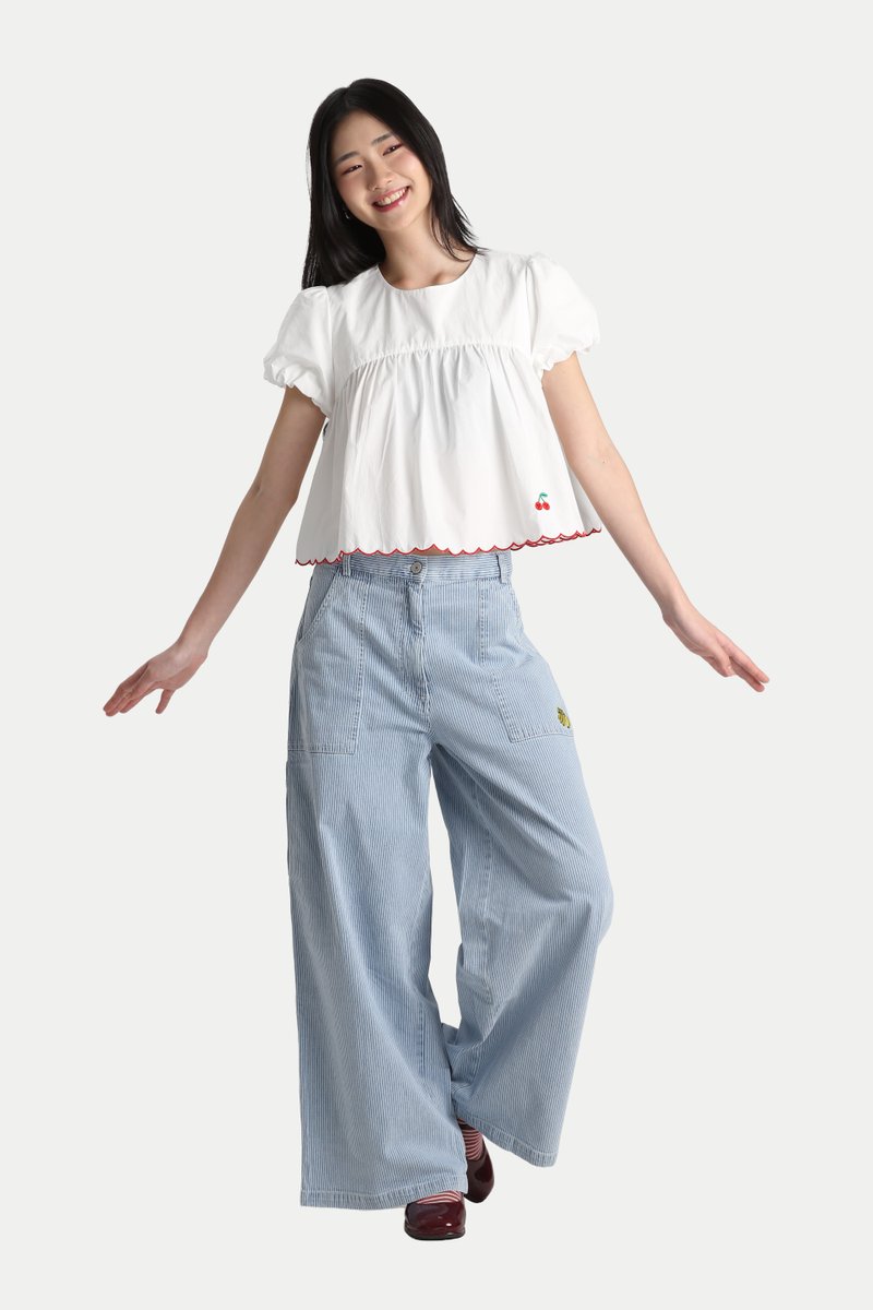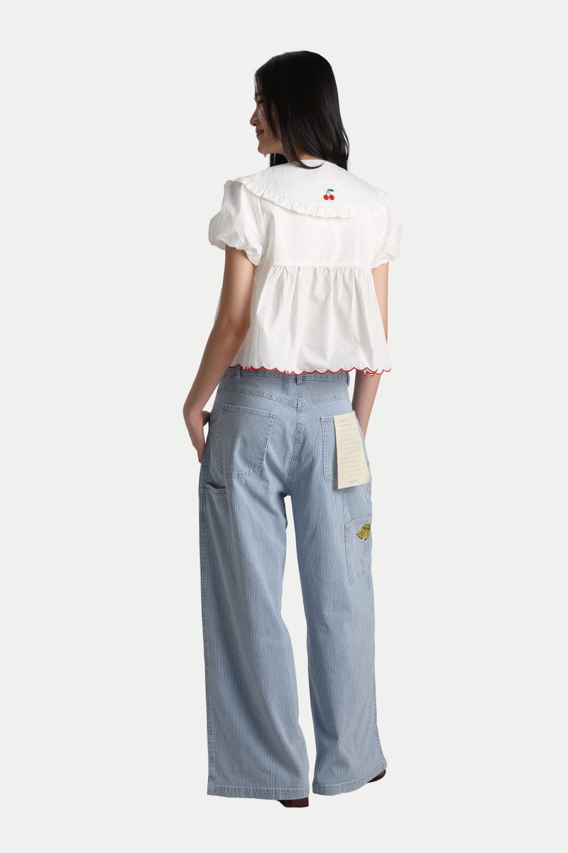 The Arcade x Tess Smith-Roberts “CHERRY” Detachable Bib Scallop Babydoll Top is trendy and quirky. Featuring Tess Smith-Roberts’ all-over fruit illustrations paired with Arcade’s in-house gingham print, it creates a charming, playful pattern. The top comes with a detachable frill bib that can be styled on or off, and its babydoll flare silhouette brings the fun illustrations to life. Easily pair it with jeans for a casual look or a mini skirt for something cute. Made from a breathable cotton-blend fabric, it’s perfect for warm weather. Opens via a back keyhole, slip-on wear. Unlined.
