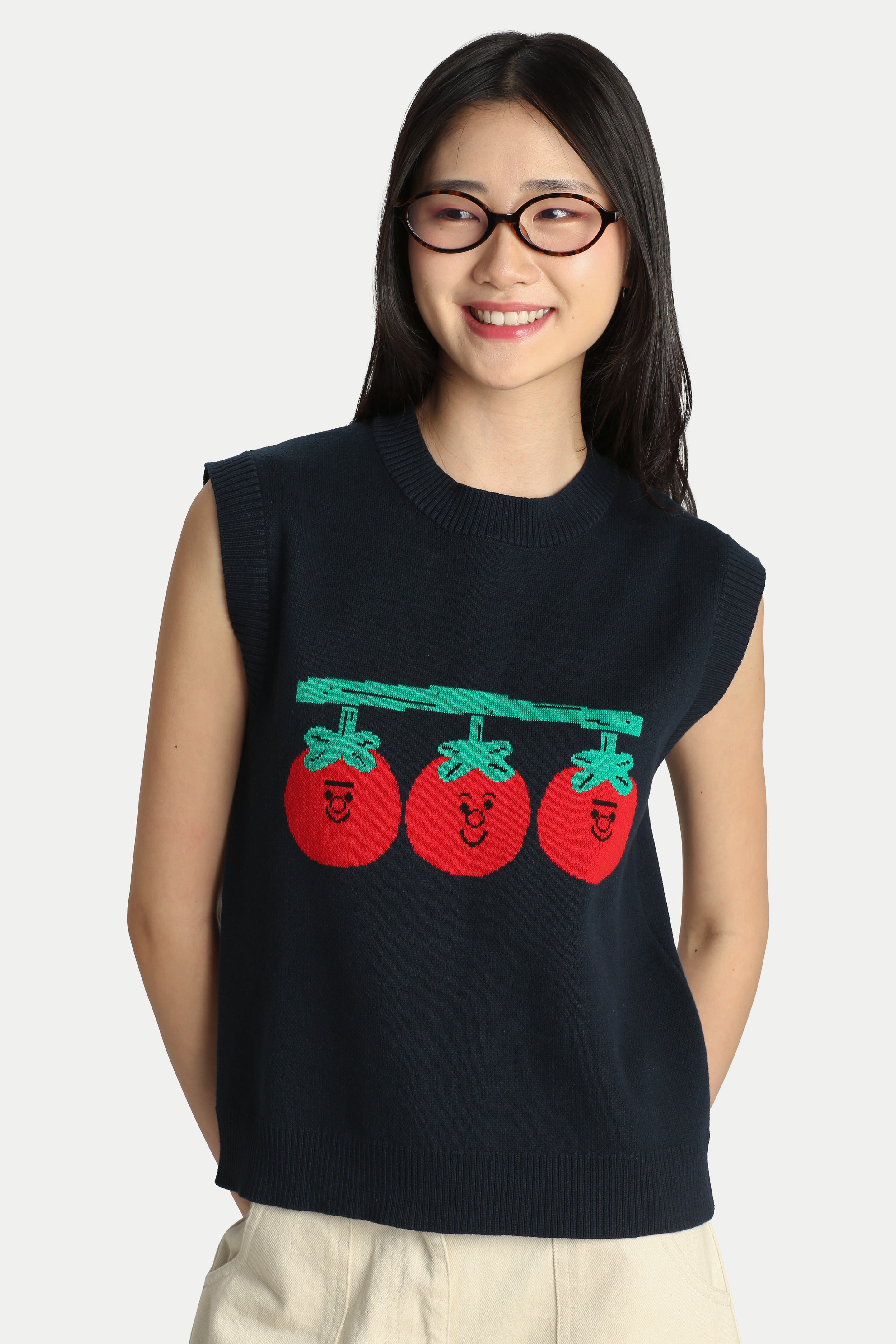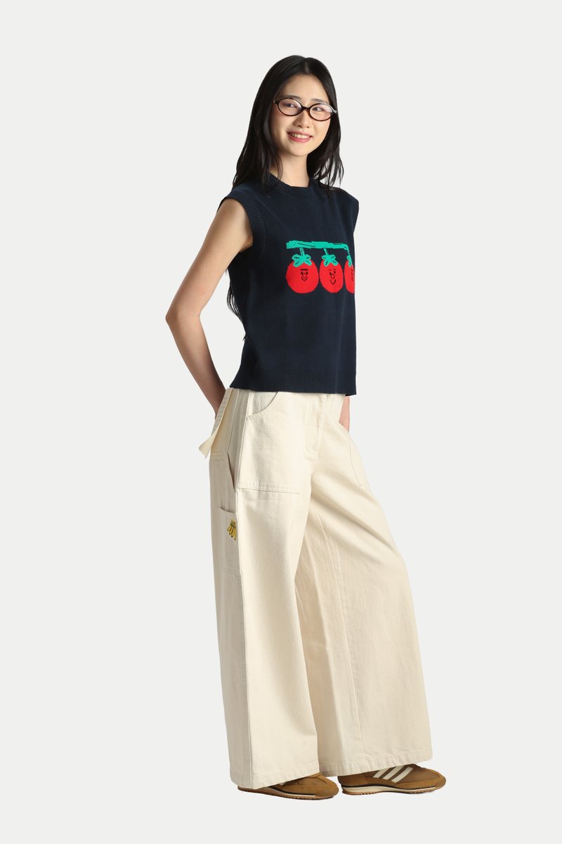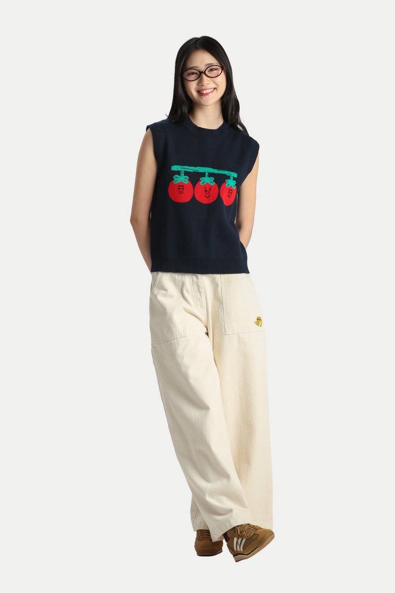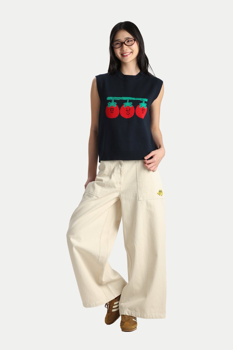 The Arcade x Tess Smith-Roberts “TOMATOES” Knitted Vest is quirky and fun. Featuring Tess Smith-Roberts’ tomato illustrations knitted into the vest, it makes a bold statement in any wardrobe. The vest has an oversized fit with a perfect length that isn’t too long. Easily style it with jeans for a laid-back look or a skirt for a girly look. Crafted from 100% cotton yarn, it’s breathable and comfortable, making it ideal for easy, slip-on wear. Unlined.