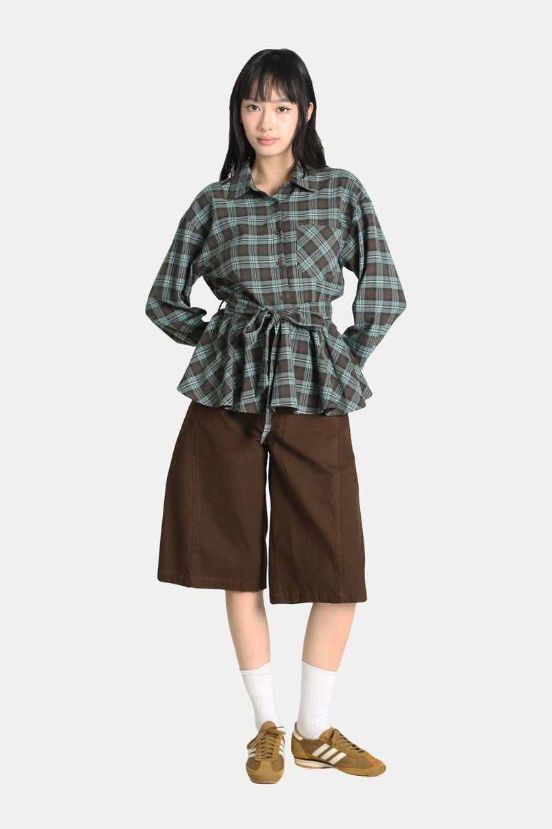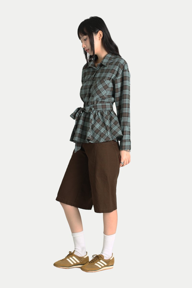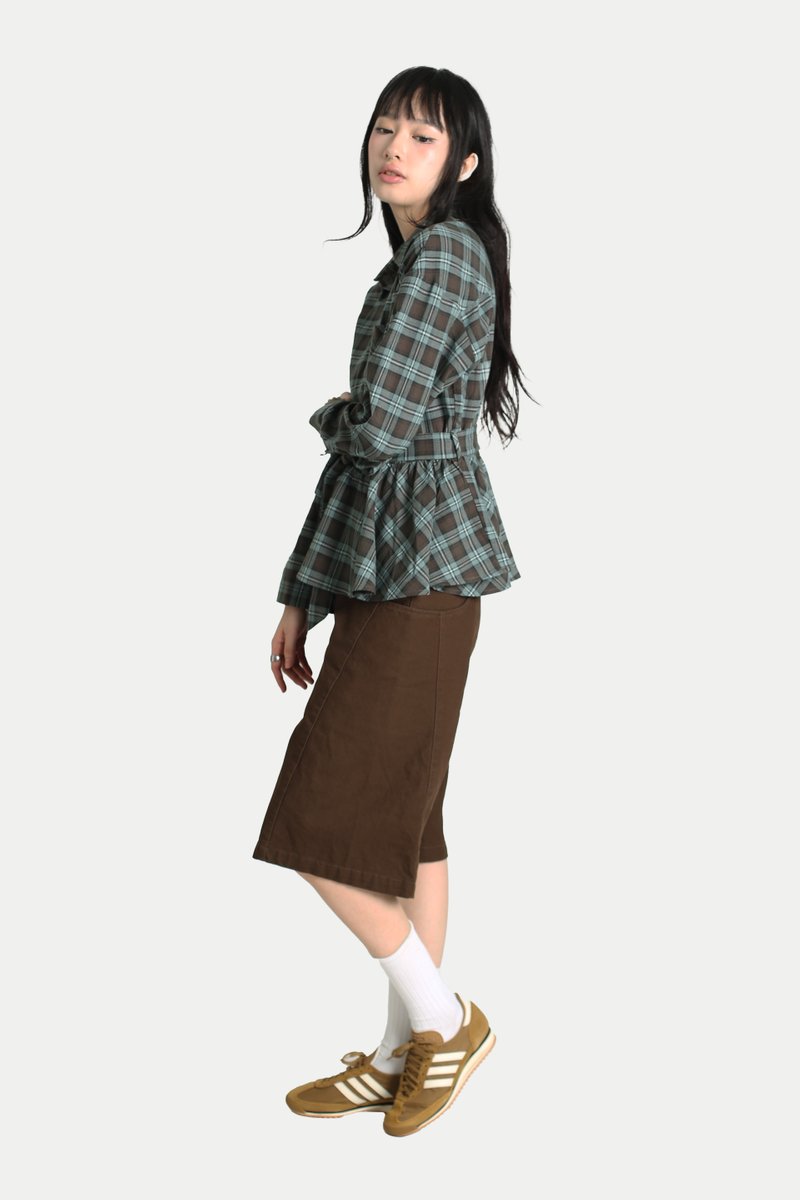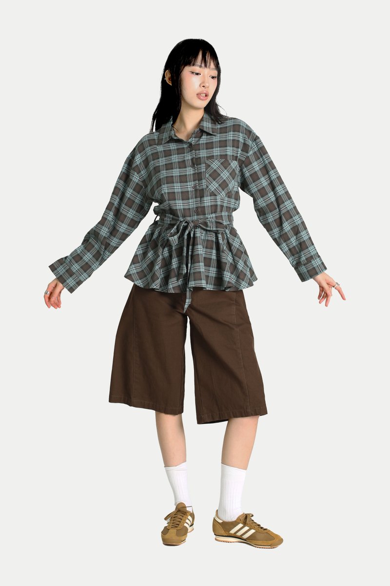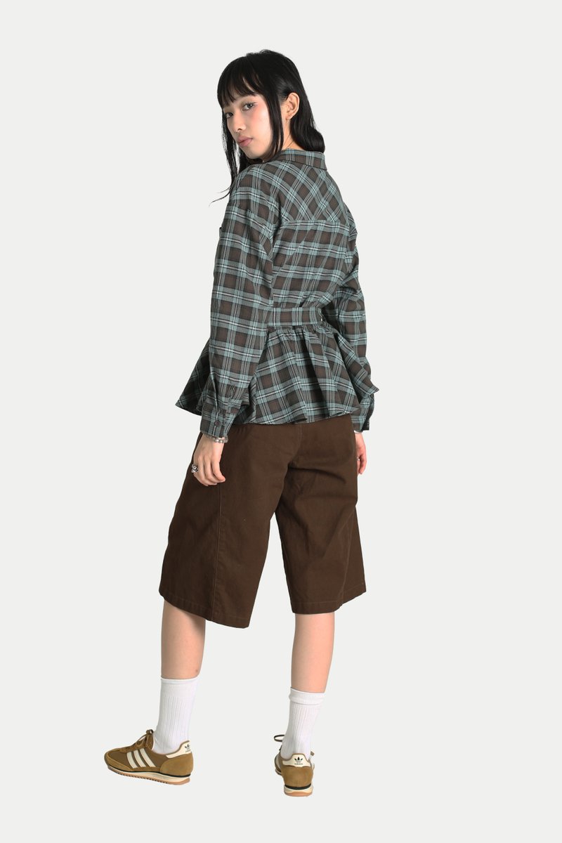 The Evelyn Peplum Flannel Shirt is a casual yet fun piece to add to your wardrobe. It features a relaxed fit with a cute peplum detail for a touch of girlish charm. Perfect for a casual brunch day out. Pair it with jorts for a laid-back look, or a mini skirt for a more feminine vibe. Cut from a comfortable cotton-blend material, ideal for everyday weather. Button-down front. Unlined.