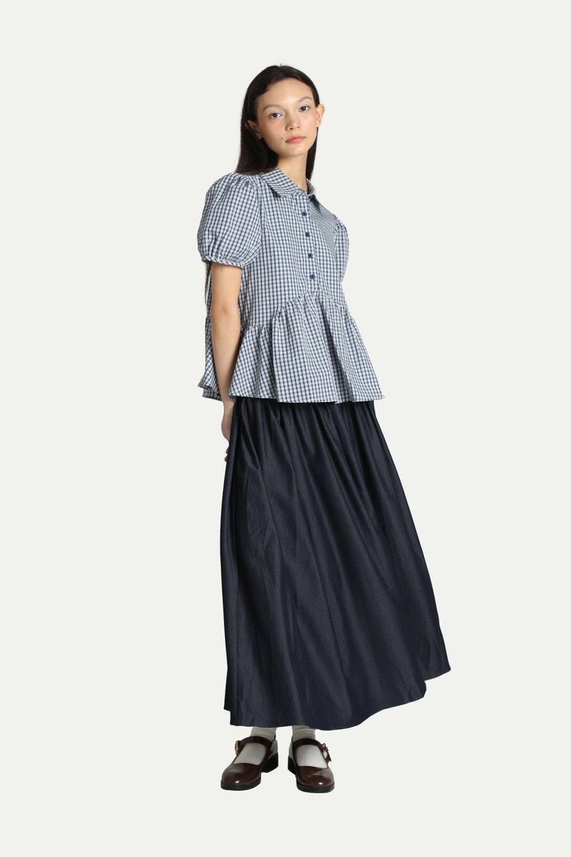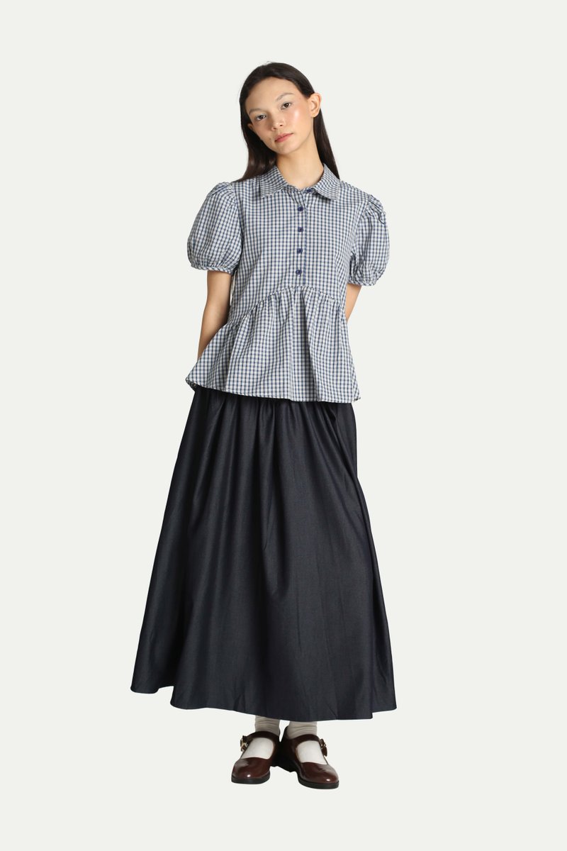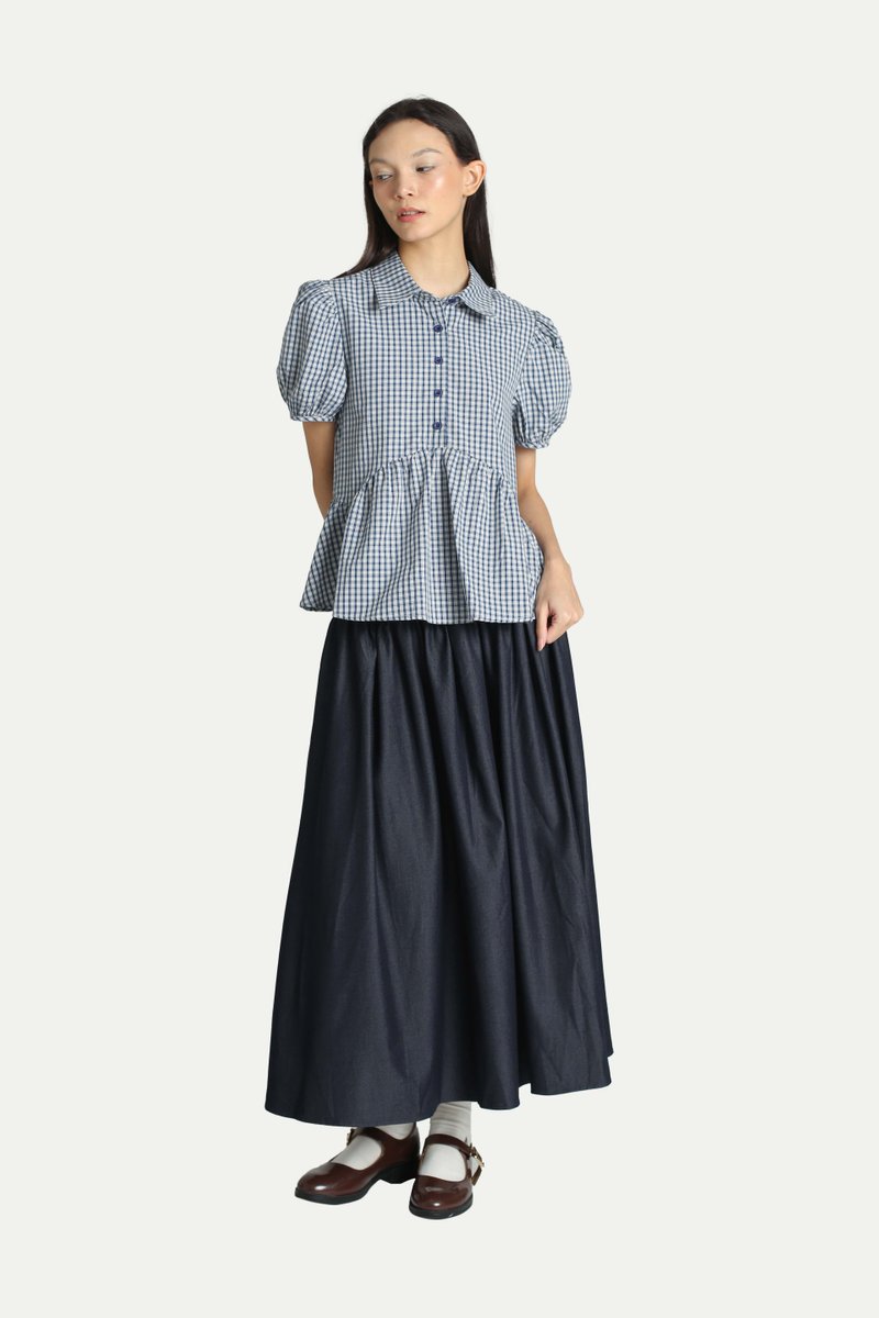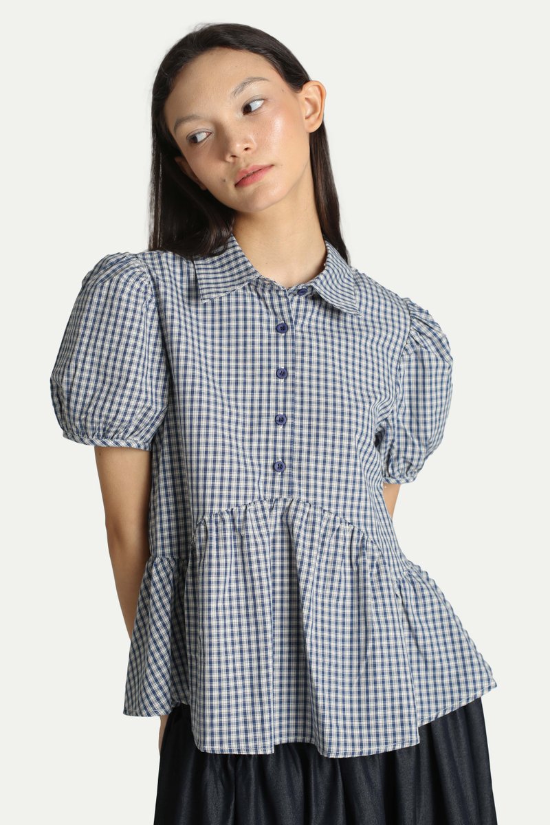 JANIE PUFF SLEEVE PEPLUM SHIRT IN BLUE CHECKS