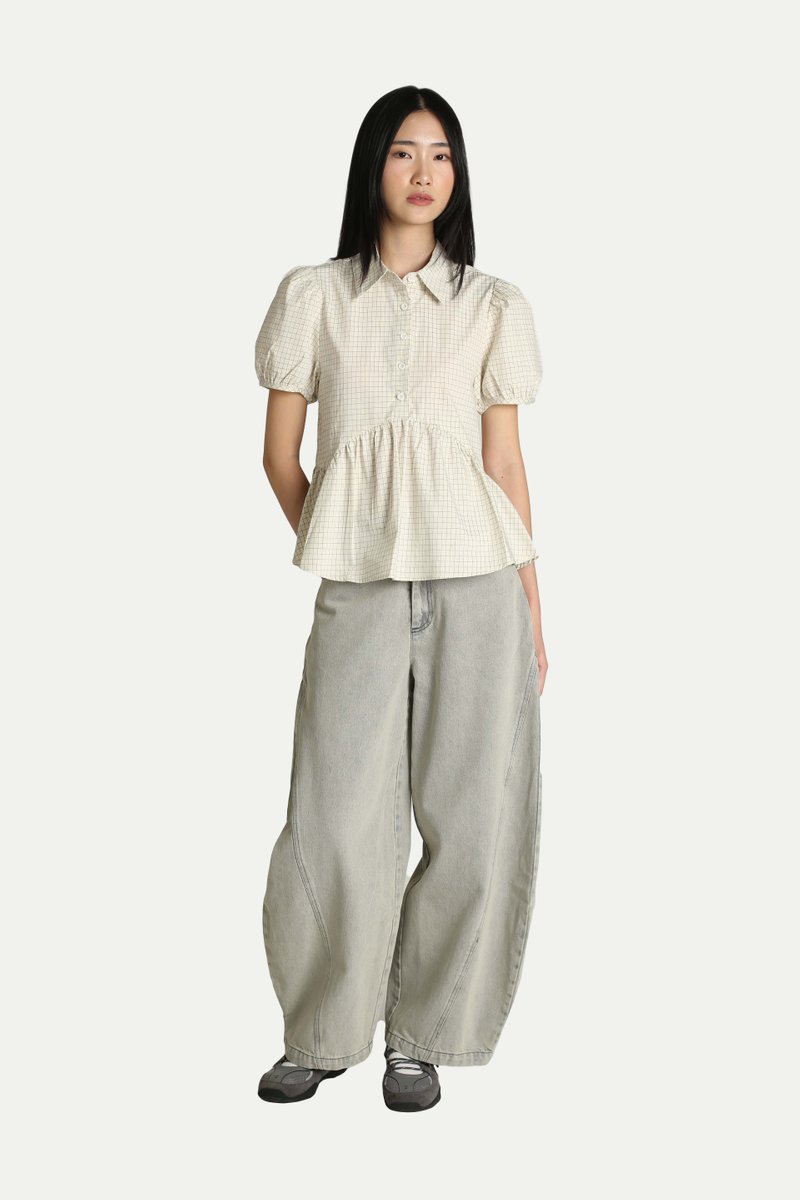 JANIE PUFF SLEEVE PEPLUM SHIRT IN CREAM CHECKS