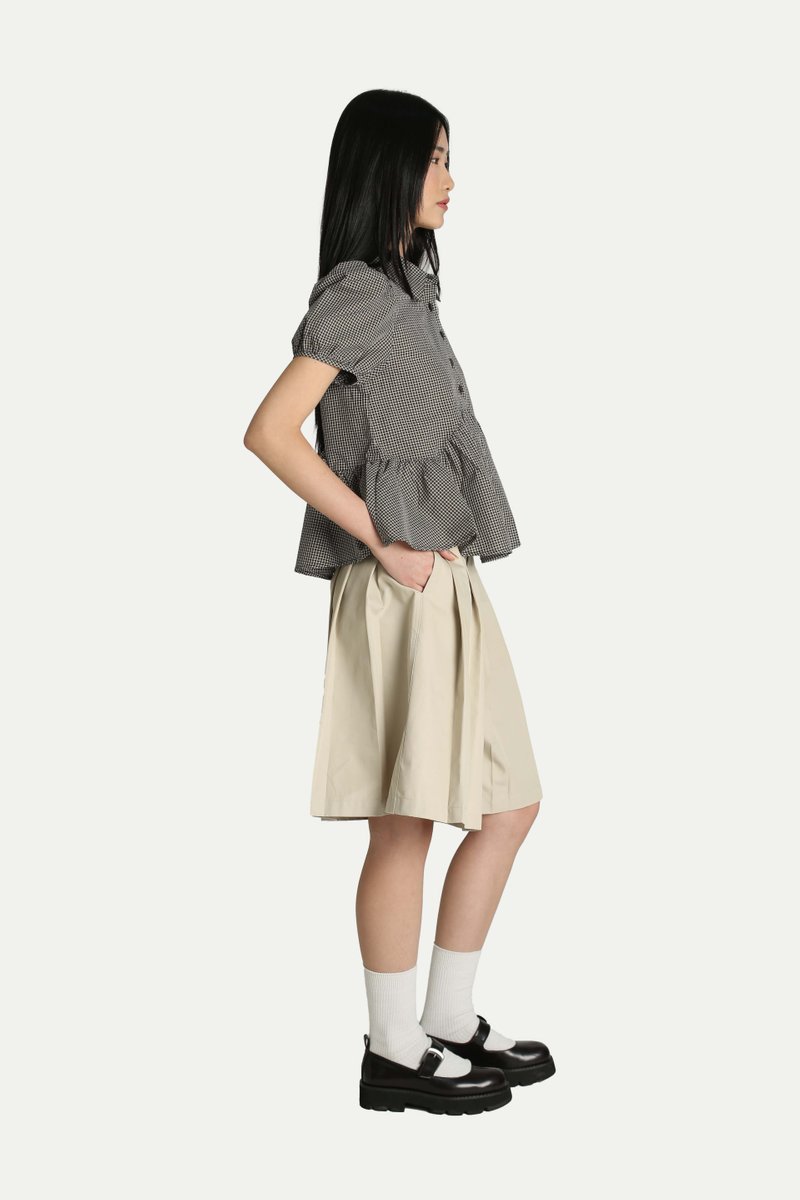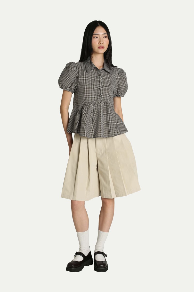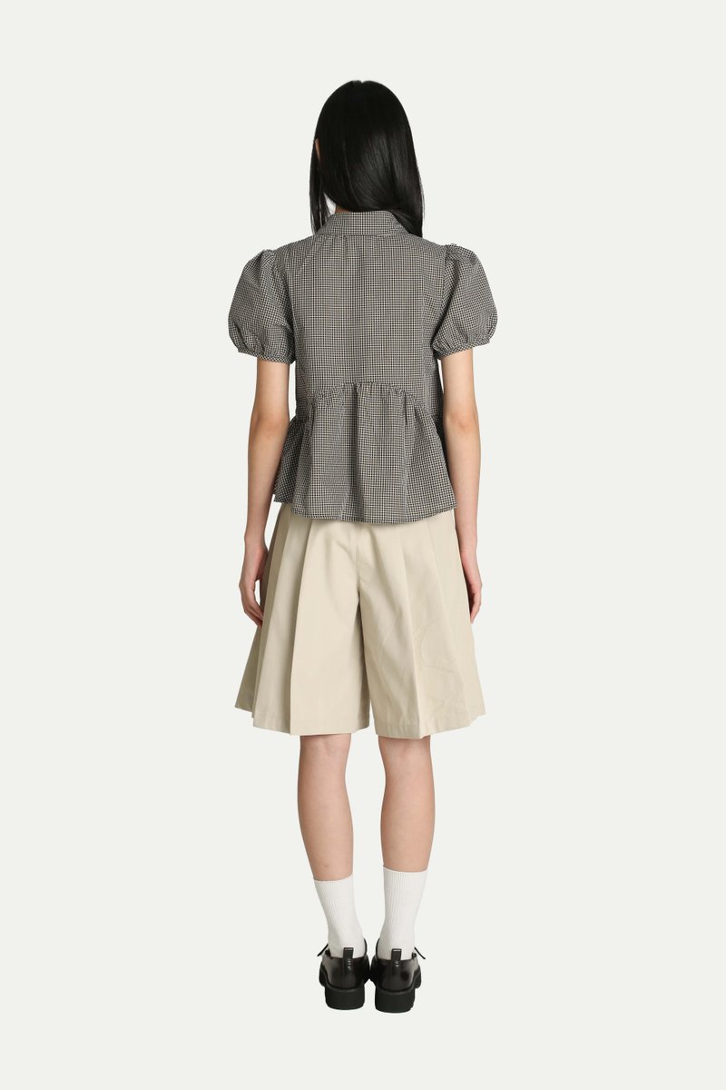 JANIE PUFF SLEEVE PEPLUM SHIRT IN OLIVE CHECKS