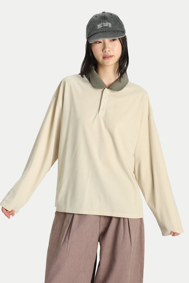 The Leia Contrast Round Collar Polo is a cute and comfortable piece to throw on and go. Crafted from a breathable cotton blend waffle jersey, it’s ideal for our hot and sunny weather. Featuring a Henley button-down design, a boxy fit, and an adorable contrasting round collar that adds a subtle pop, this piece is both easy and stylish. Just throw it on with your favourite bottoms and you're all set for a comfy day. Slip-on wear. Unlined.