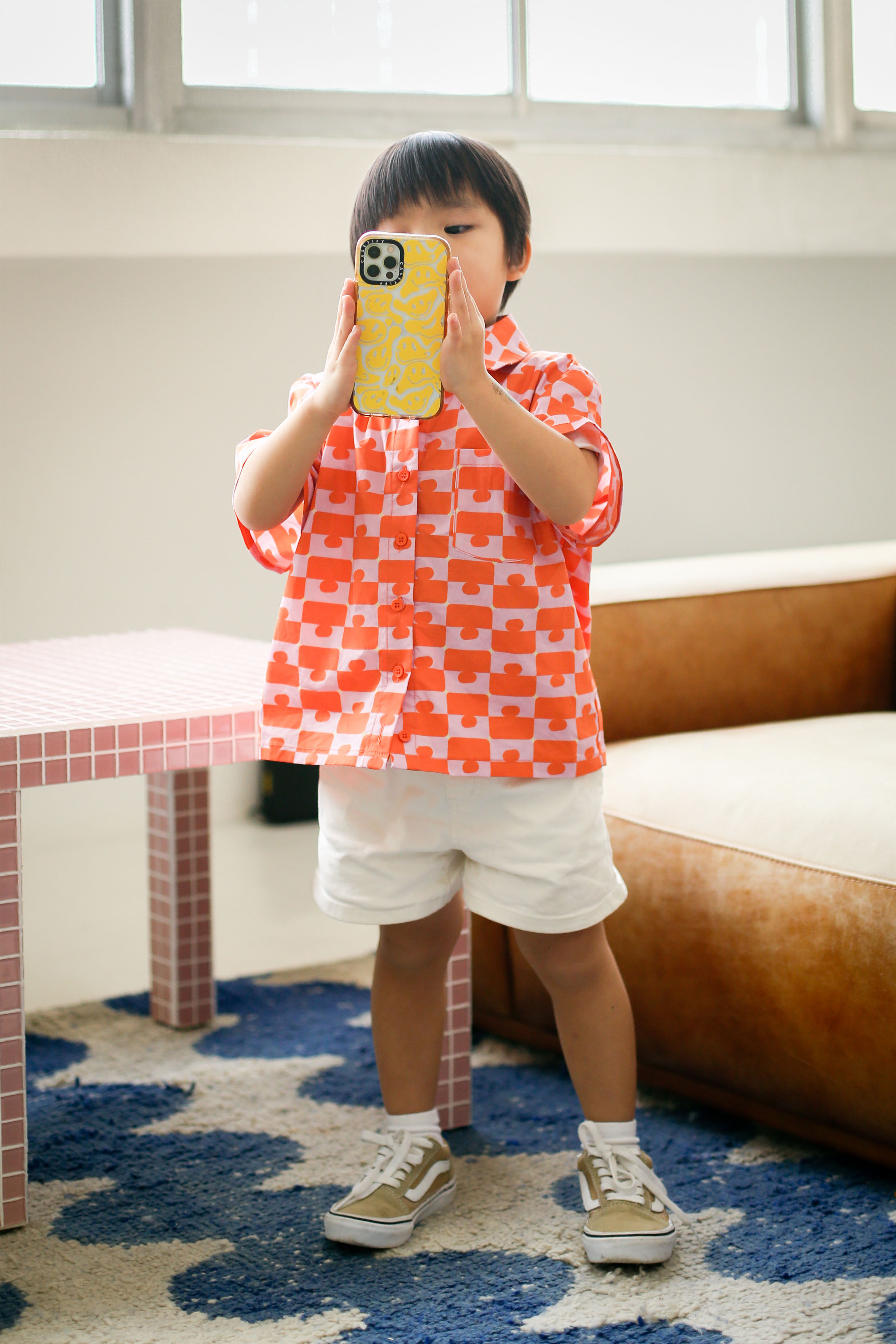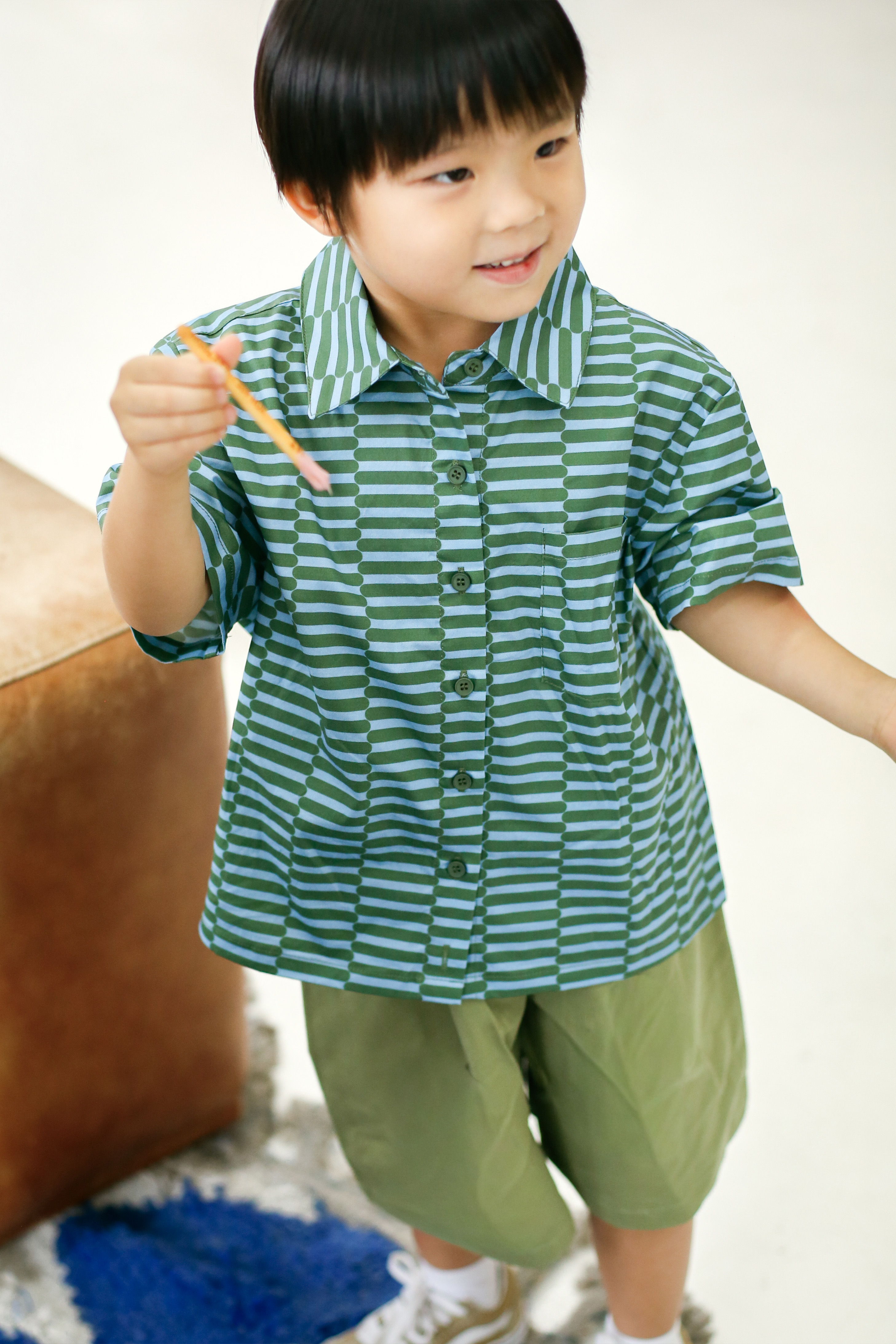 Our Elodie "JIGGY" Mini Shirt is an in house design which is perfect for a quirky and fun look. It is made of a cotton blend fabric which is breathable and cut in a boxy silhouette keeping your little one stylish yet comfortable. Best of all, you can also twin with your mini-me in the adult version. The shirt can be styled together with our Evie "JIGGY" Mini Shorts and it is unisex so your little girls can wear it too. Open via button down front. Unlined.