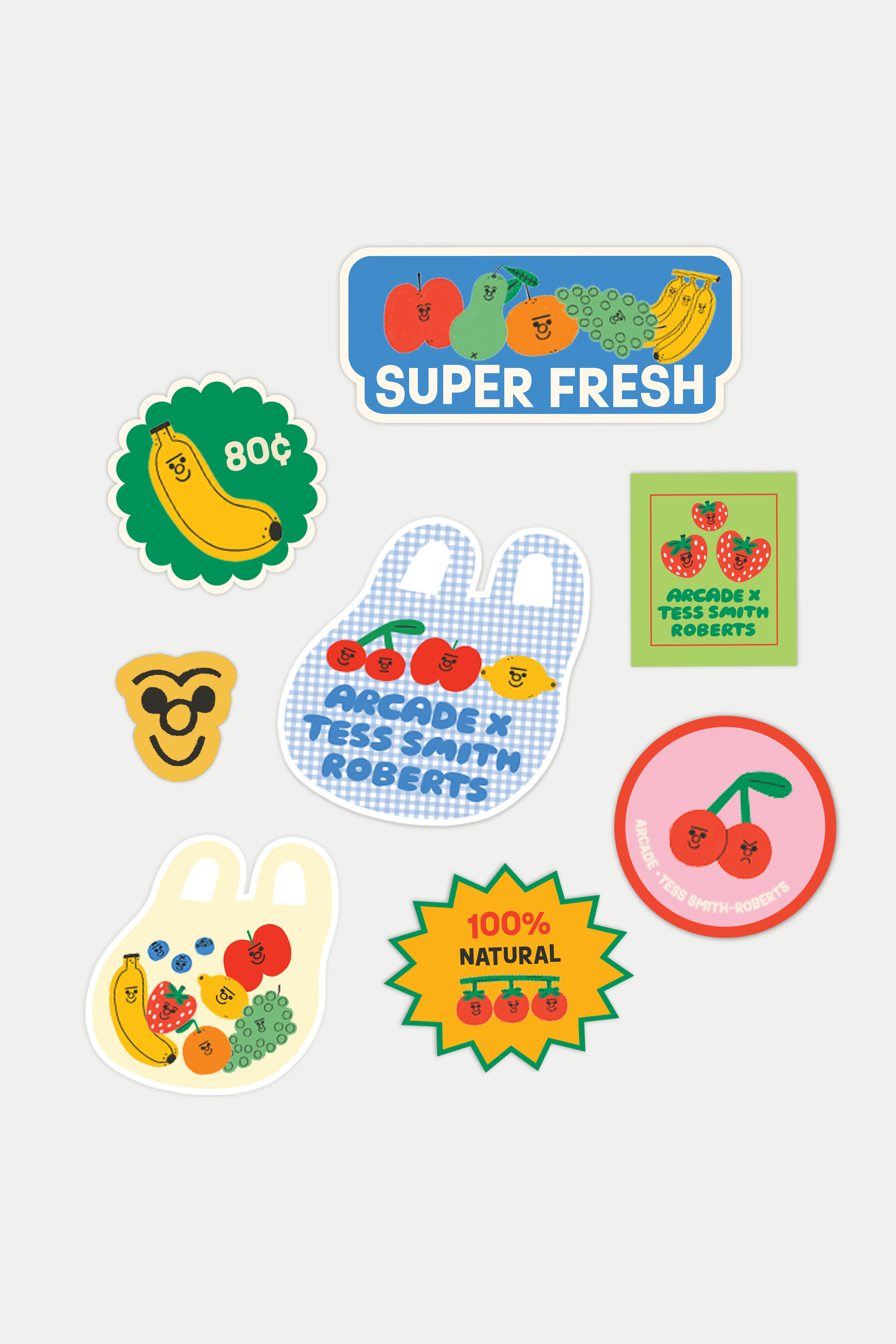 The Arcade x Tess Smith-Roberts “FRESH FINDS” 8-Sticker Pack is the perfect little treat for yourself or a thoughtful gift for someone special. Featuring a curated set of 8 unique designs, each sticker showcases her signature quirky and playful illustrations. Perfect for journaling, decorating your laptop, phone case, or notebooks, these stickers add a fun and personal touch to your everyday items. Cute, vibrant, and full of character, they’re made to brighten your day.
