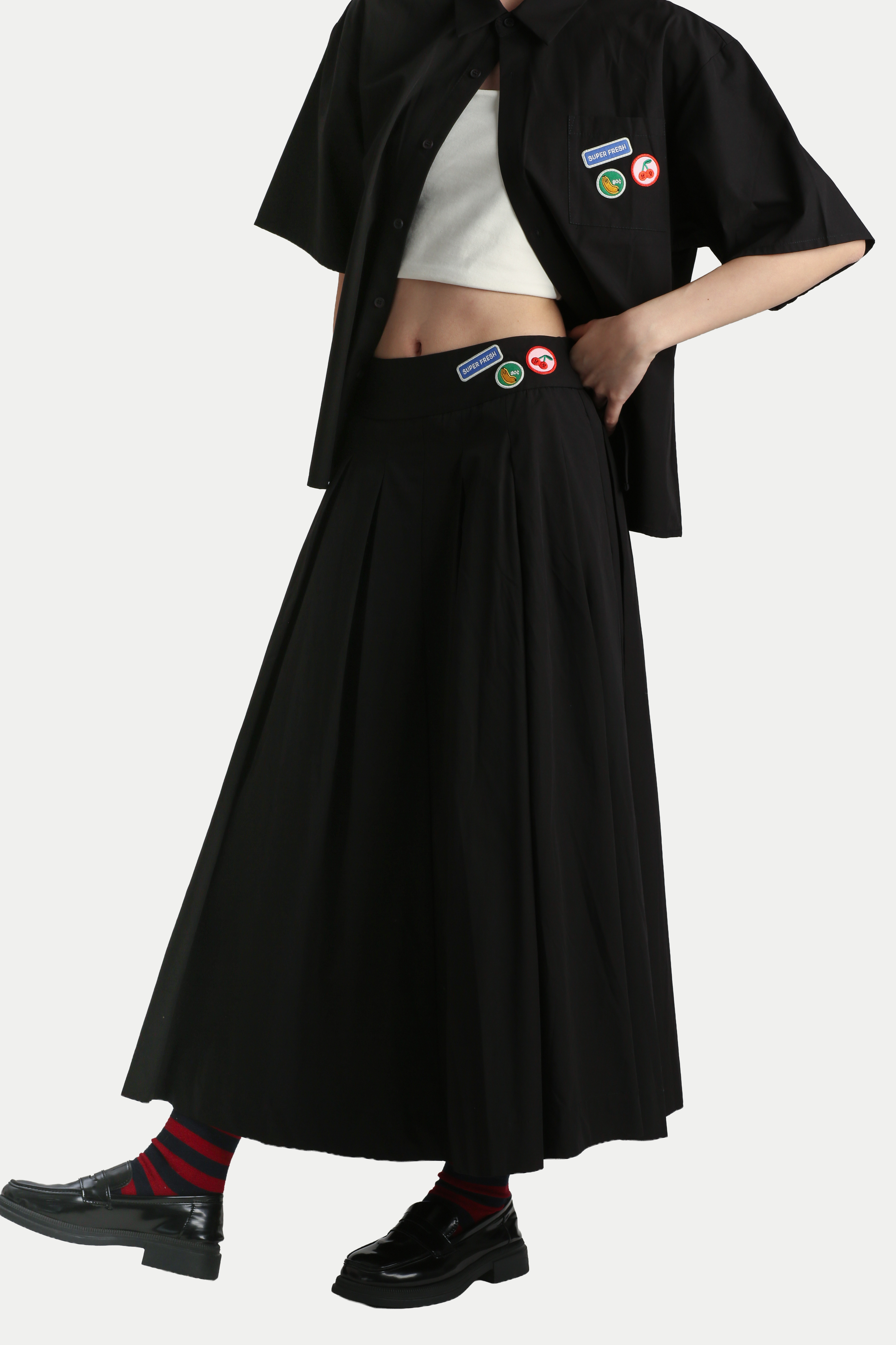 The Arcade x Tess Smith-Roberts "SUPER FRESH" Pleated Skirt is timeless yet distinct. Featuring Tess Smith-Roberts’ signature fruit illustrations reimagined as patches along the waistband, it adds a playful touch while maintaining a classic, easy-to-wear silhouette. Designed with box pleats all around, the skirt creates a beautiful flare and subtle movement. Style it with a crisp shirt for a preppy look, or pair it with a baby tee for something more casual and cute. Cut from a breathable cotton-blend fabric, it is lightweight and comfortable. Opens via a concealed back zipper and comes with side pockets. Lined.