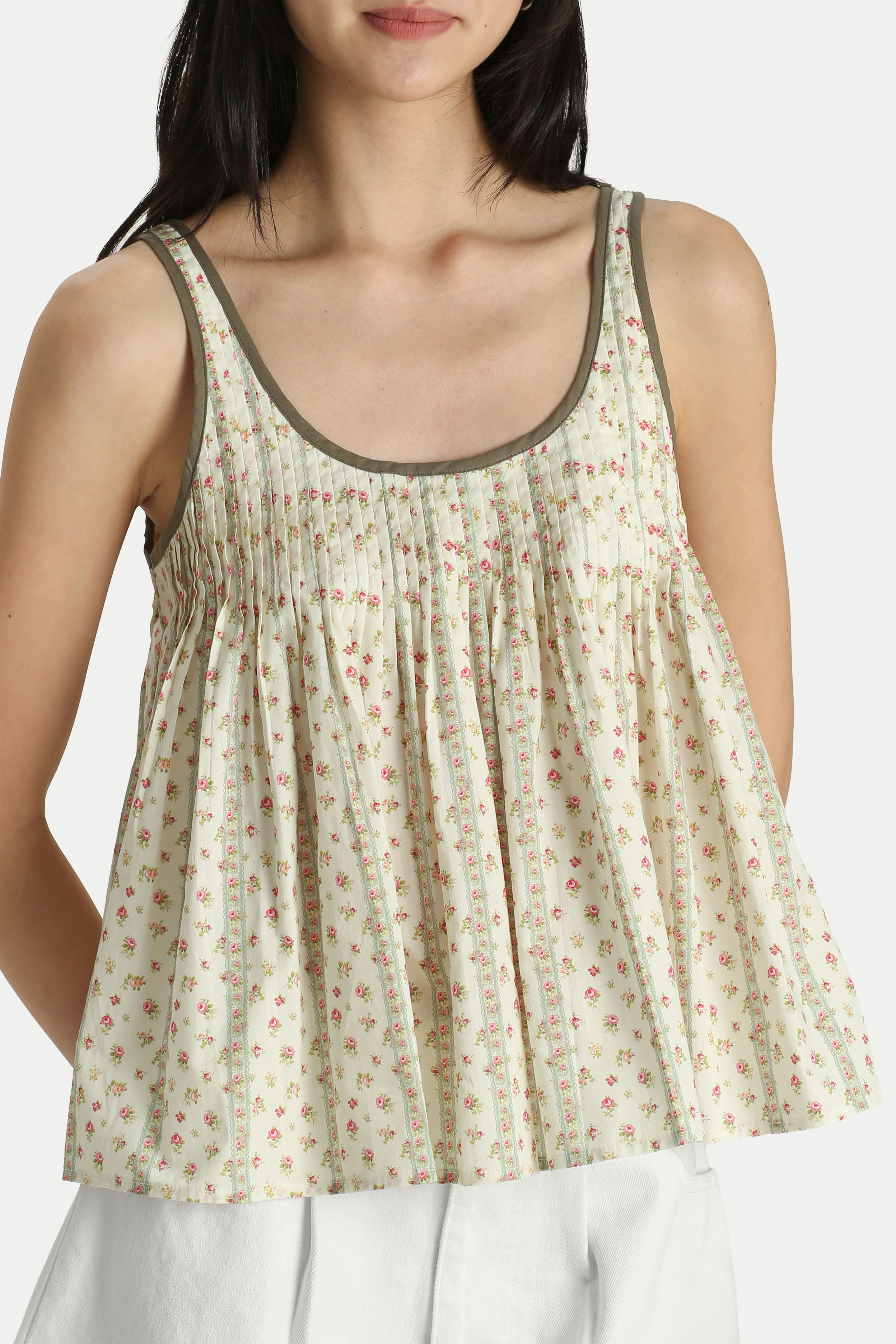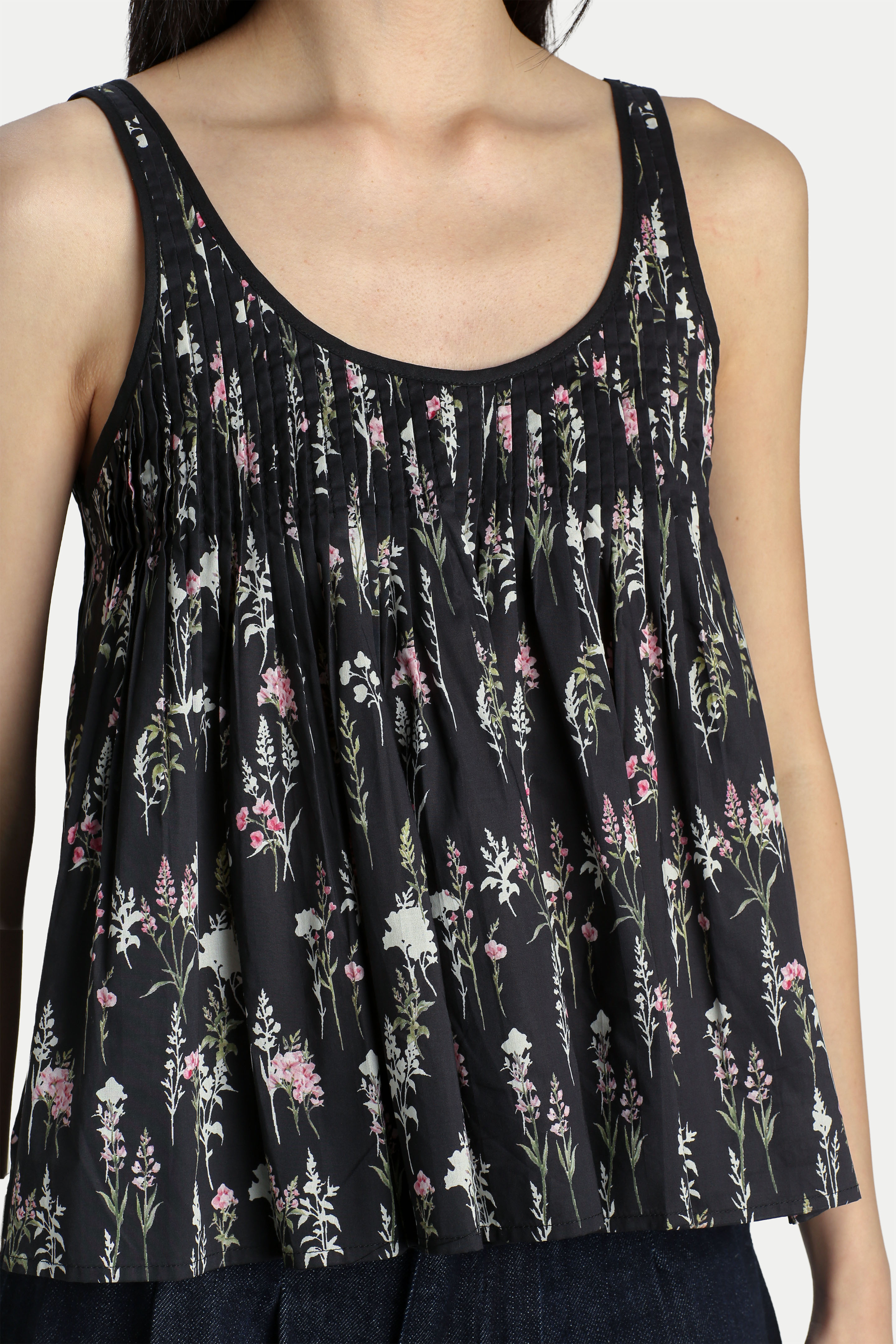 Looking for a cute top that can be worn on its own or layered? The Alice Pintuck Pleat Floral Top is the perfect piece to have. Designed with a flattering flared silhouette, contrasting trimmings, and pintuck pleats all around, it creates a beautiful flow. Style it with jeans for a cute and casual look, or pair it with a mini skirt for a girl-next-door vibe. Slip-on wear. Unlined.