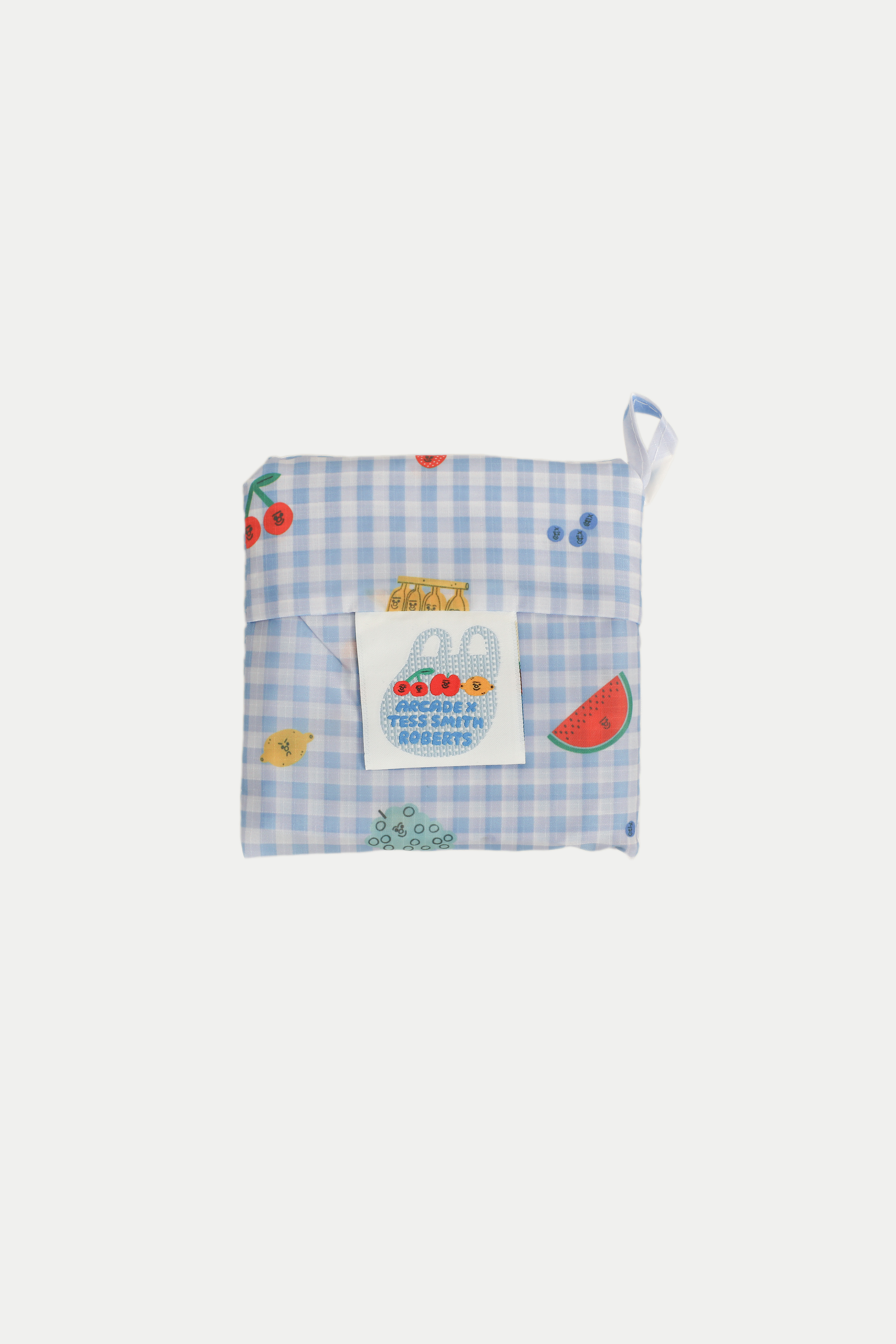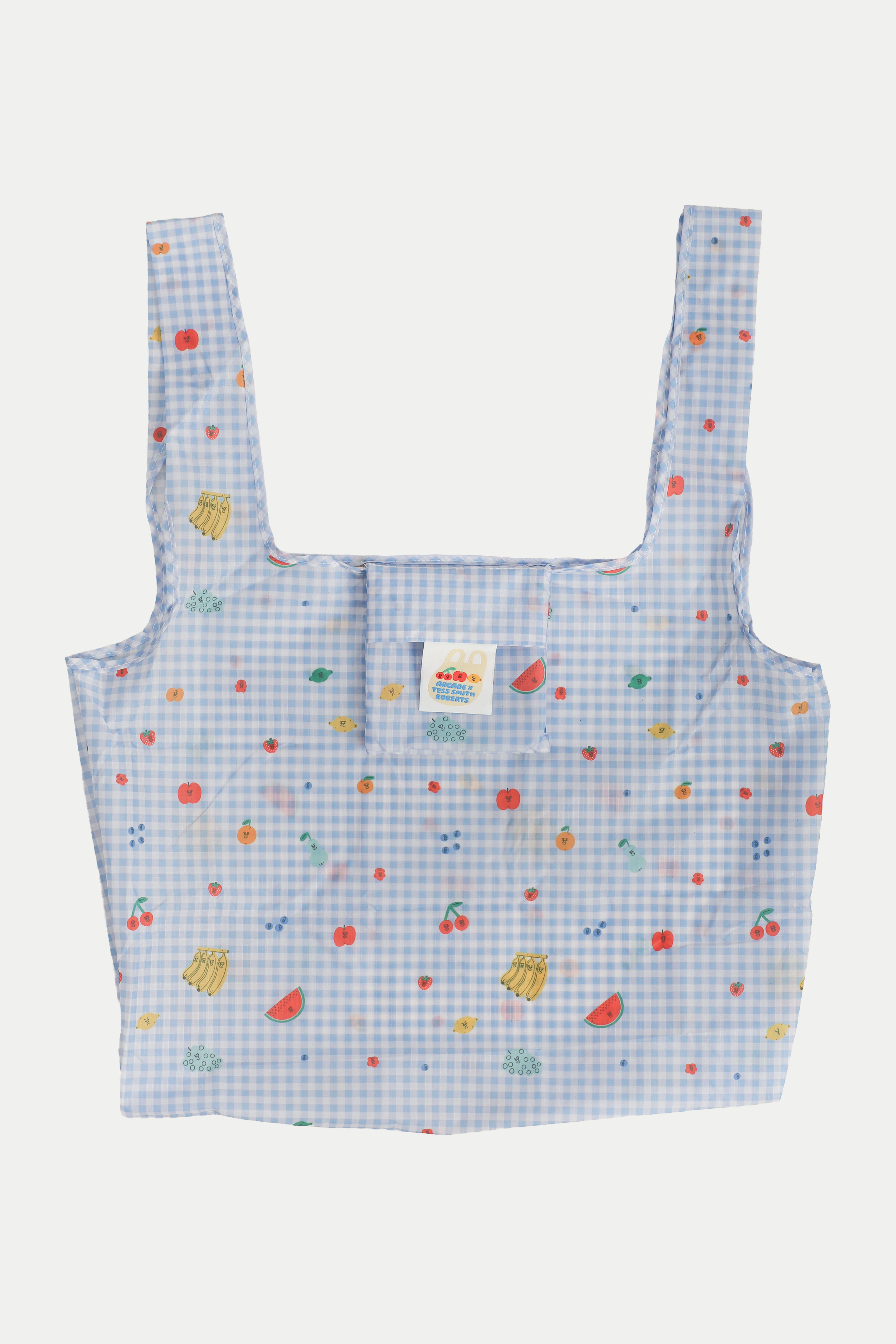 The Arcade x Tess Smith-Roberts “SUNDAY MARKET” Foldable Grocery Bag is an everyday essential made for effortless shopping. Featuring her signature fruit illustrations set against Arcade’s in-house gingham base print, it brings a bright and playful charm to your daily errands. Lightweight and designed to be foldable into a compact size, it’s easy to carry around wherever you go. Perfect for spontaneous grocery runs or keeping in your bag just in case. Practical, reusable, and undeniably cute.
