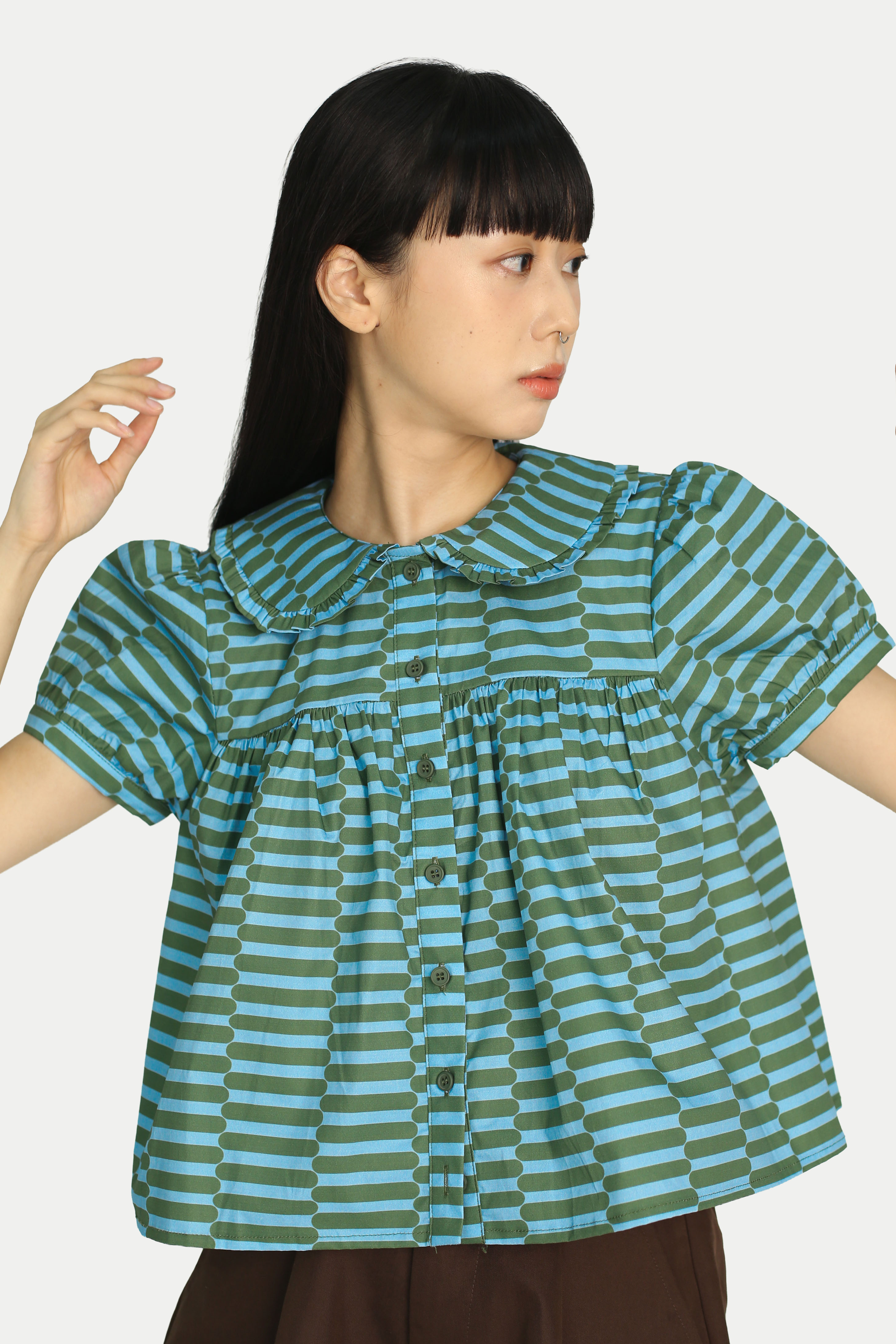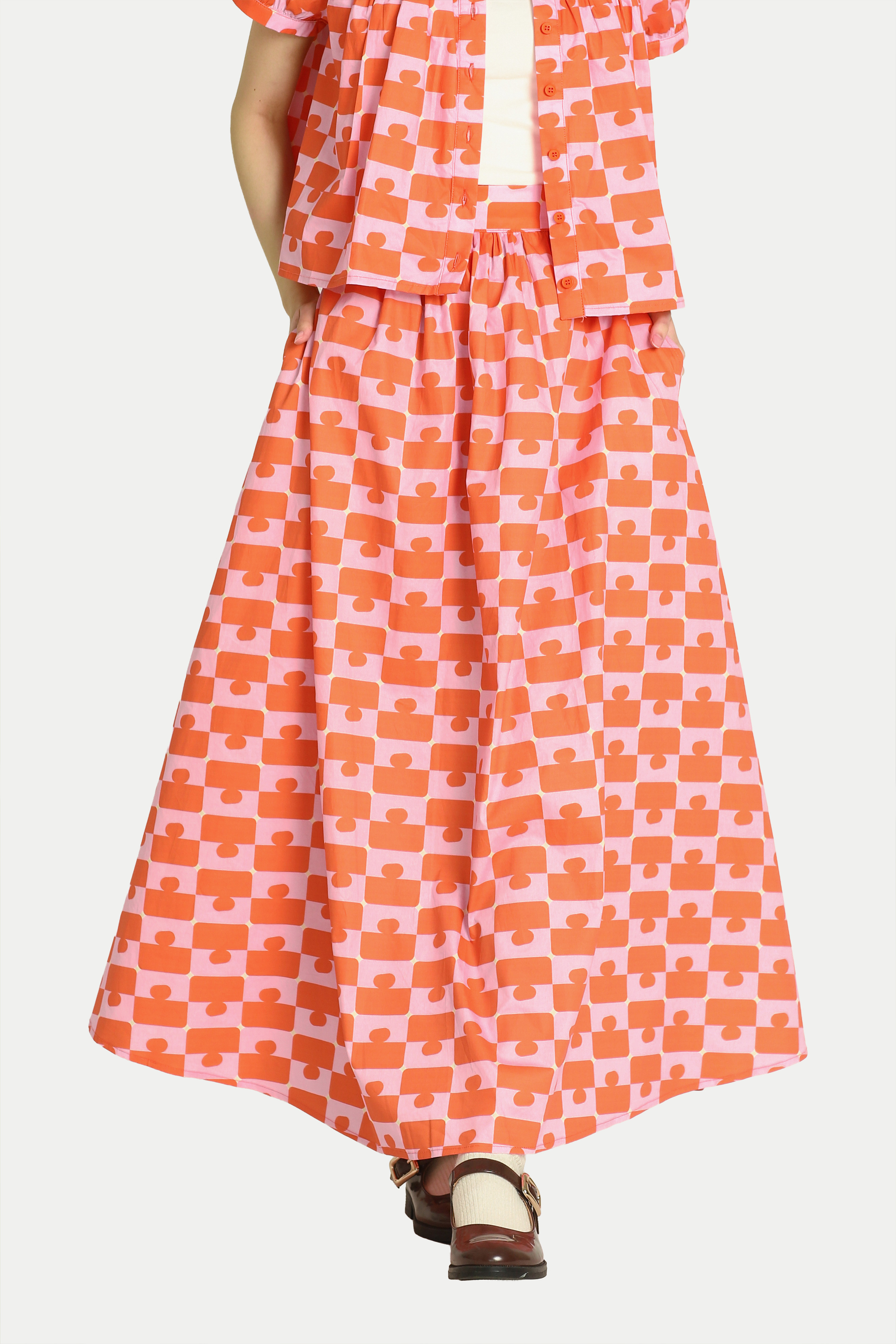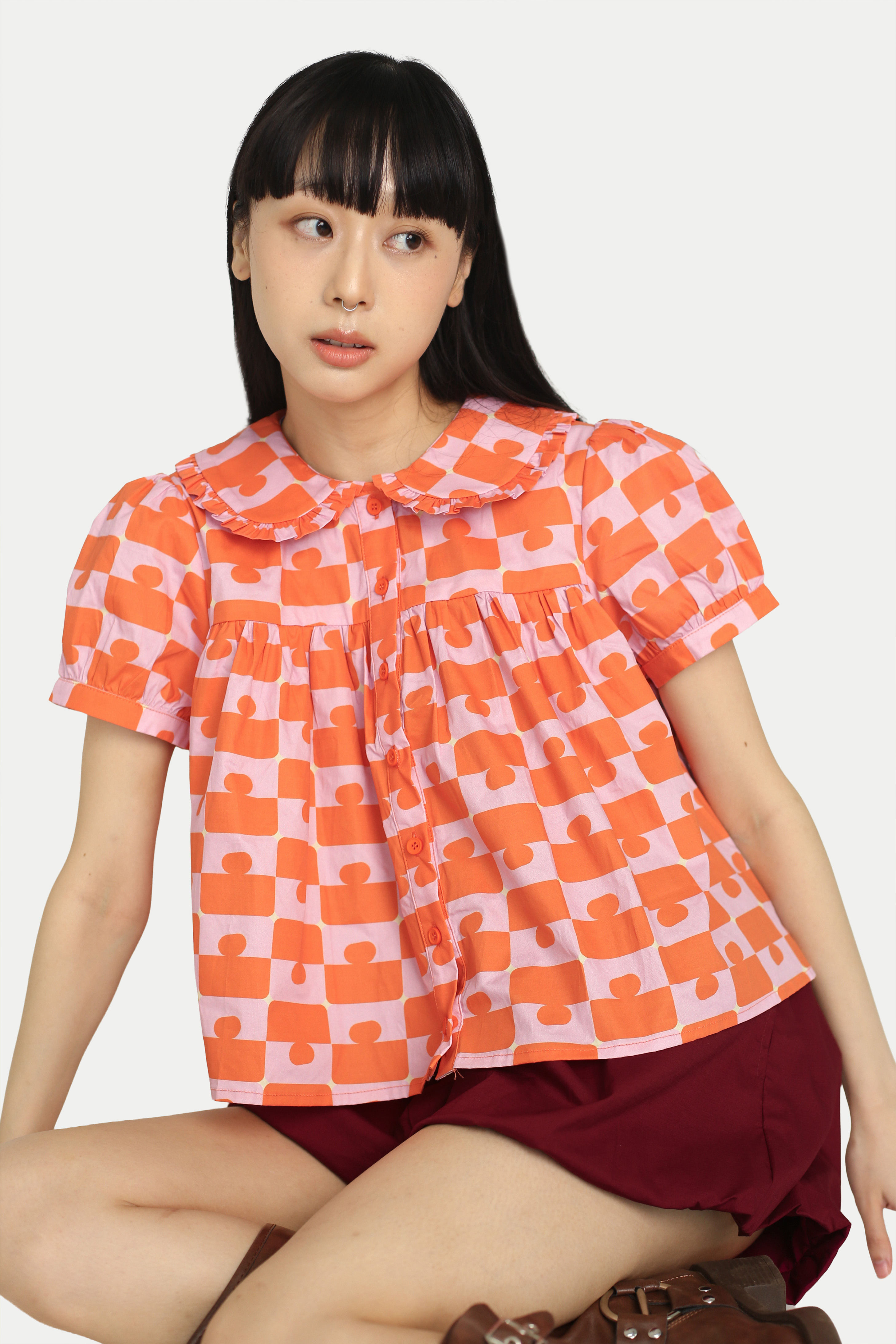 Feeling the festive season and looking for a fun top? Our Josie “GROOVY” Babydoll Top is both cute and comfortable. Featuring a rounded gathered collar, puff sleeves, and a flared silhouette, it creates an effortlessly charming look. Not to forget our in-house print, which elevates the festive feel and makes it a statement piece. Pair it with our Madlyn “JIGGY” Midi Gather Skirt for a complete set. Opens with front buttons. Unlined.